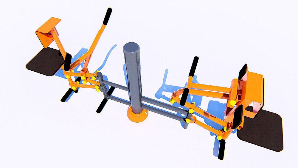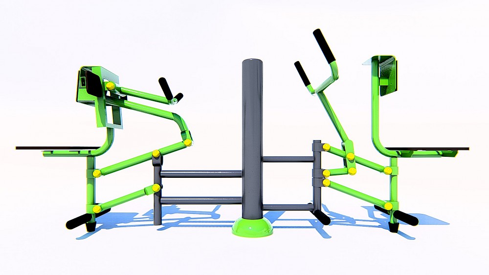 Materiāli, kas izmantoti ražošanā: – Tērauda caurules, kuru sieniņu biezums ne mazāks par 3 mm, apstrādātas ar smilšu staru un krāsotas ar pulvera metodi. Tērauda elementi, pārklāti ar polimēru. – Tērauda profili, apstrādāti ar smilšu staru un krāsoti ar pulvera metodi. – Slēgta tipa gultņi. – Cinkoti savienojuma elementi. – Skrūves paslēptas ar plastmasas vāciņiem. Rokturi gumijas. – Sēdvieta no nepaslīpošas pārklāja.