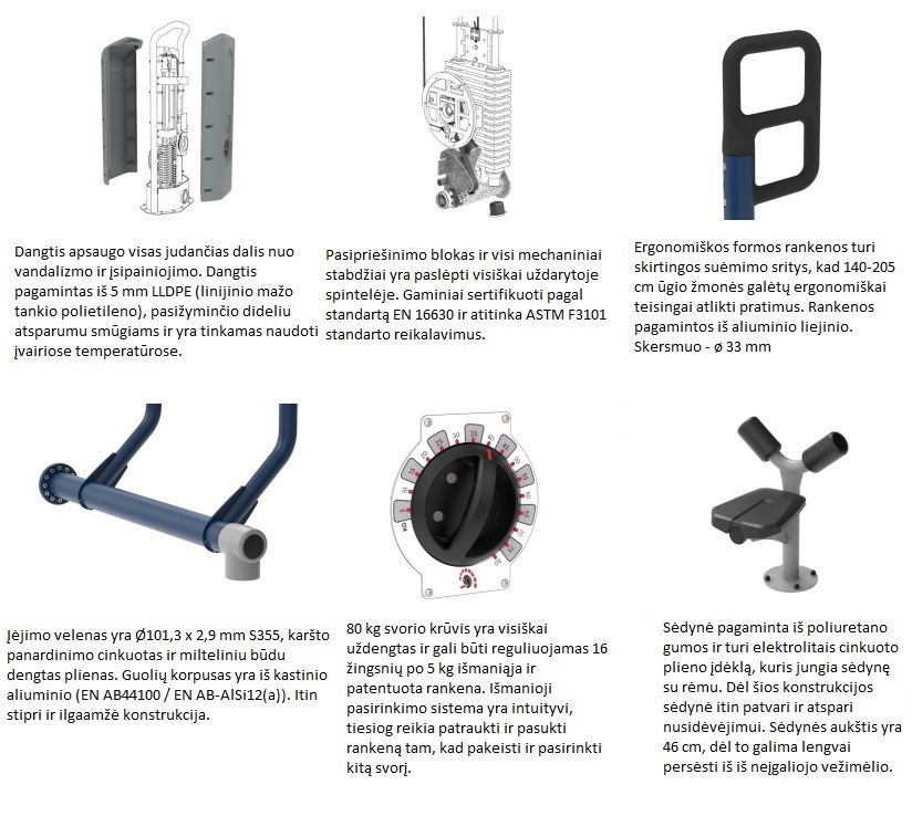 Reguliuojama apkrova ir daugiafunkcinės rankenos padeda atlikti individualiai pritaikytus pratimus, kurie stiprina pečių adduktorių, pečių tiesėjų ir alkūnių lenkėjų raumenis vertikaliu judesiu žemyn. Jėgos treniruokliai ir suoliukai leidžia paprastai, saugiai ir veiksmingai treniruoti visas pagrindines raumenų grupes. Tai padidina kasdienį funkcinį pajėgumą, ypač vyresnio amžiaus žmonėms, sportinį pajėgumą, estetinę išvaizdą ir medžiagų apykaita. 80 kg svorio krūvis yra visiškai uždengtas ir gali būti reguliuojamas 16 žingsnių po 5 kg išmaniąja ir patentuota rankena.