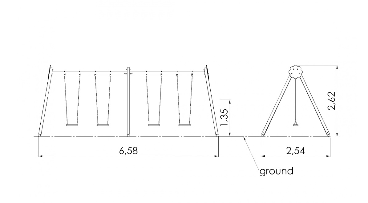 Ant sūpynių konstrukcijos galima pakabinti 4 sėdynes. Šoniniai stulpai pagaminti iš medienos ir prie žemės pritvirtinti įbetonuojant. Balkiai pagaminti iš milteliniu būdu dažyto plieno.