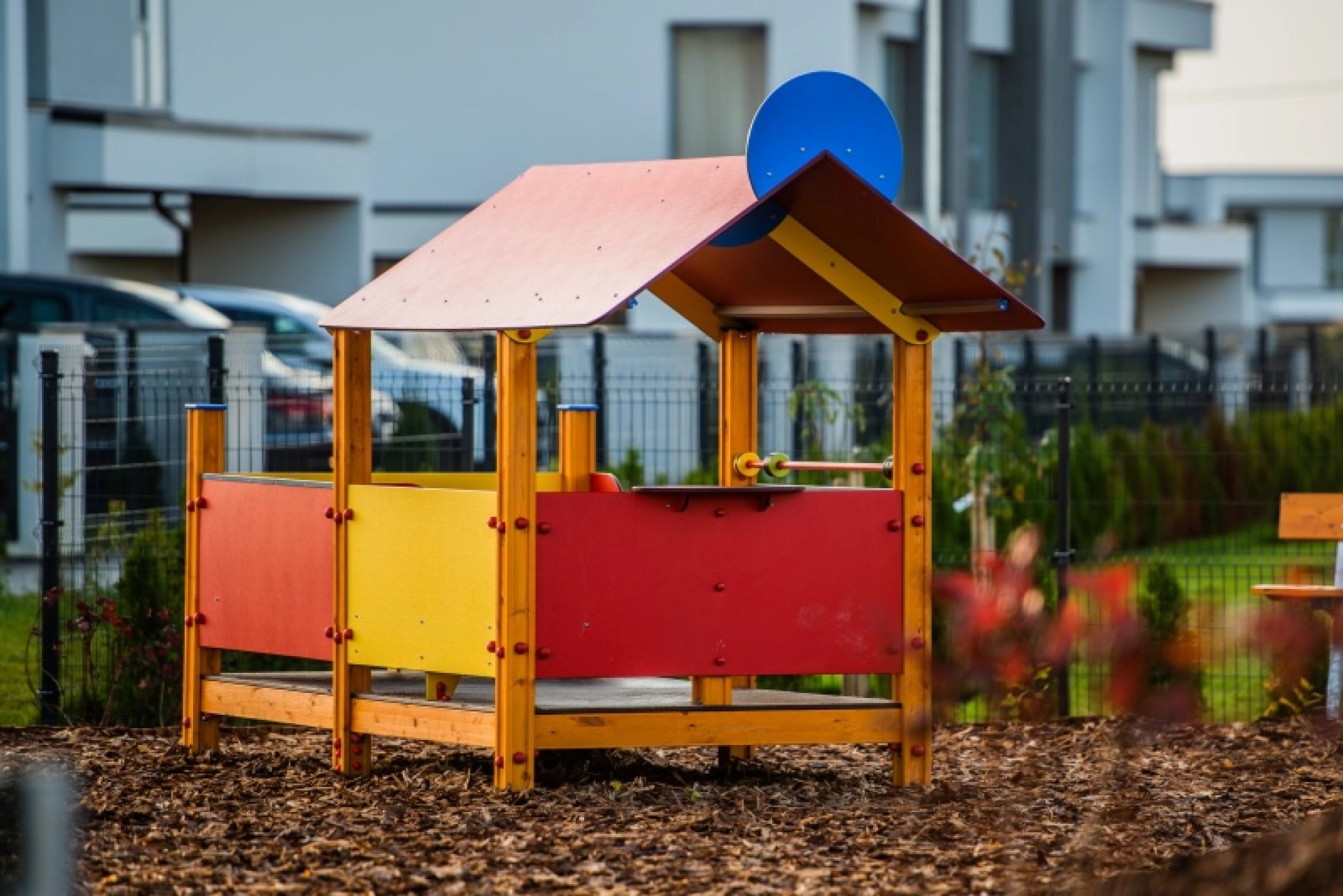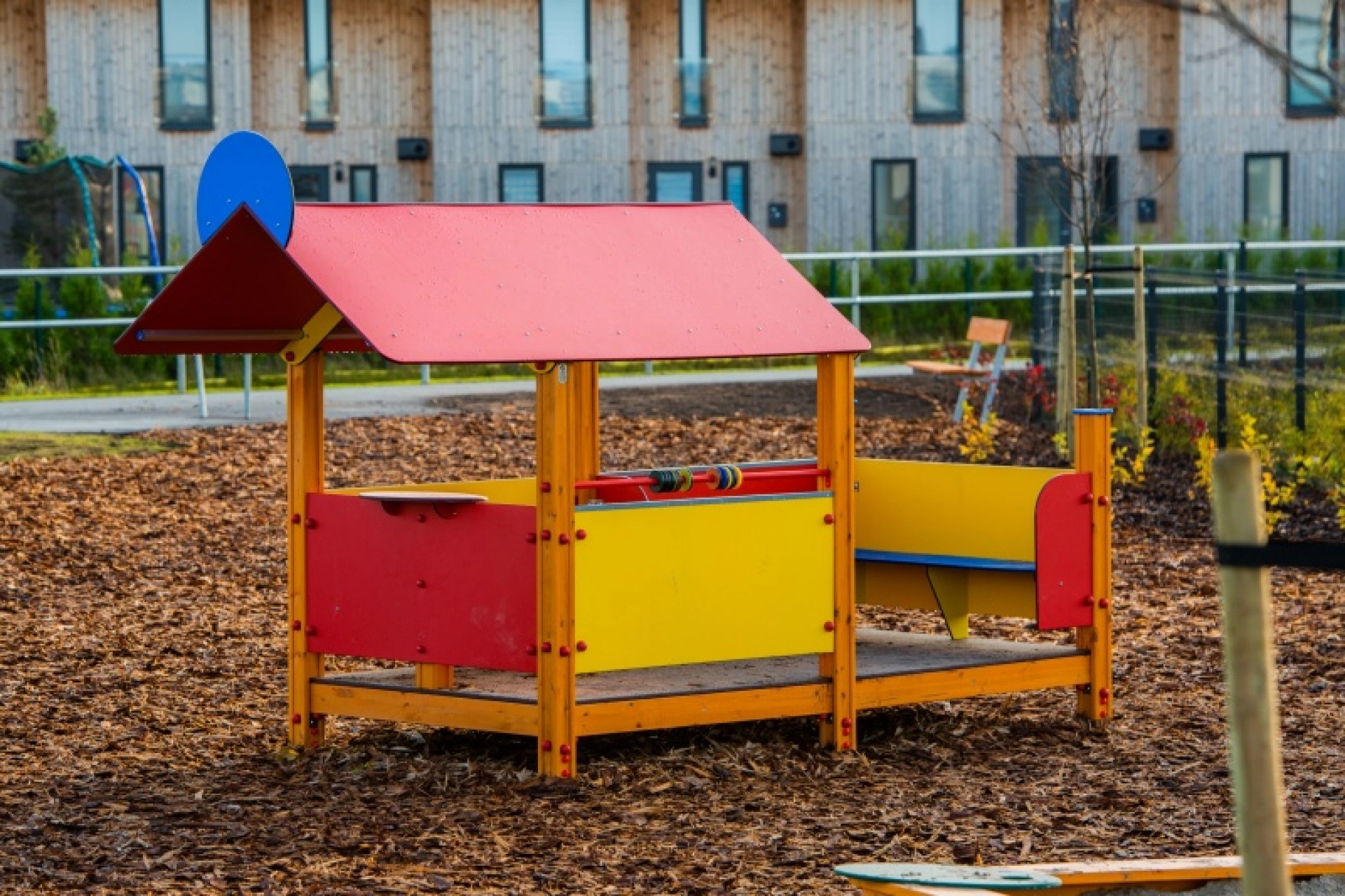 Žaidimų namelis su gražia terasa, kurioje yra du suoliukai, abakas ir žaidimų stalas.