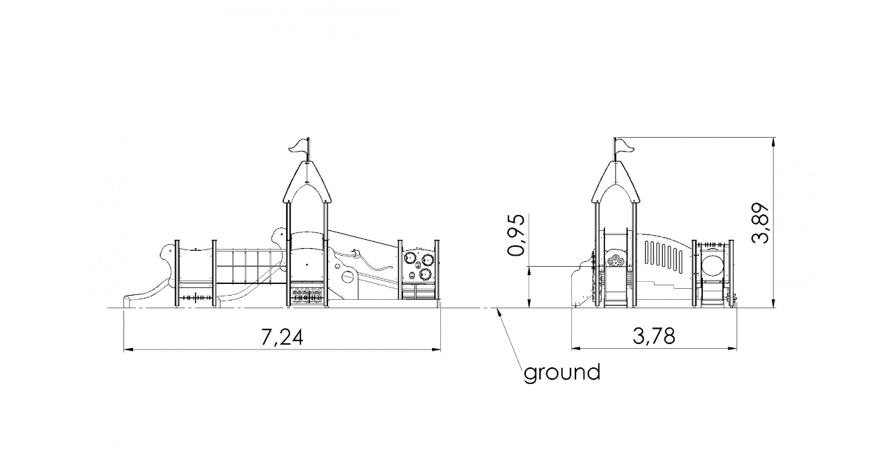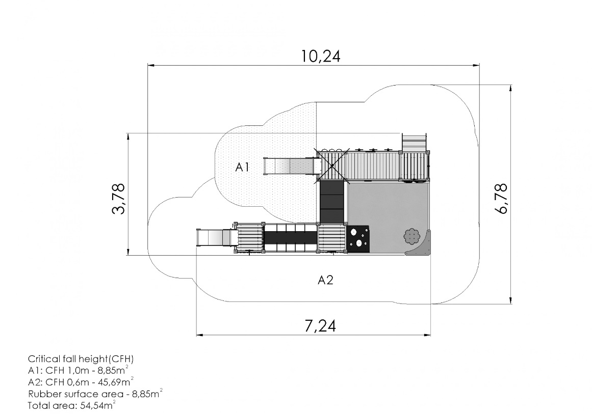 Šiame mažylių žaidimų centre su keturiomis platformomis yra įvairių elementų, padedančių lavinti bendrąją motoriką ir skatinančių aktyvius žaidimus. Į platformas veda laiptai su turėklais ir rampa su pakopomis. Saugus tinklo tiltas su turėklais, dvi rampos su laipteliais ir du šliaužimo skydai jungia platformas, o nusileidimo kalnelis vėl nuleidžia vaikus žemyn. Žaidimų centre yra integruota smėlio dėžė, kurioje įrengtas nedidelis žaidimų stalas ir kampinės platformos, kuriose galima kurti įvairiausius smėlio kūrinius. Smulkiąją motoriką lavinti padeda skaičiuotuvas, kelios besisukančios plokštės, žaidimas “Tic-Tac-Toe”, laikrodis su rodyklėmis, judantys burlaiviai ir penki kapitonų vairai.