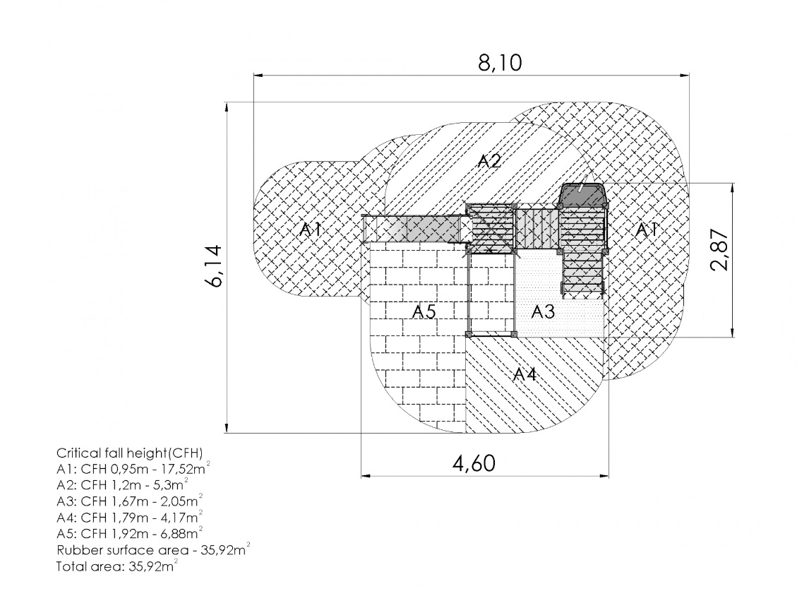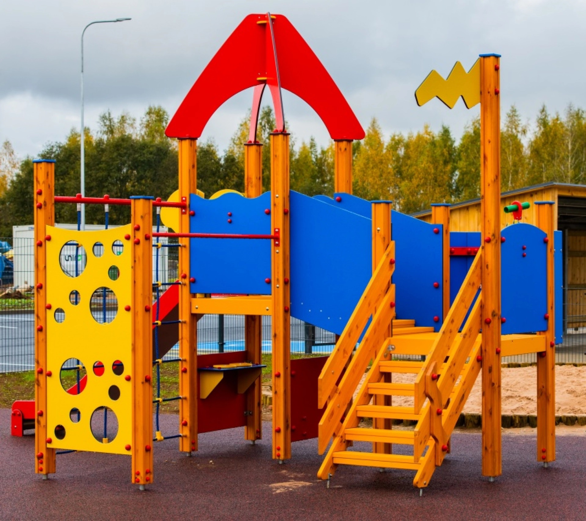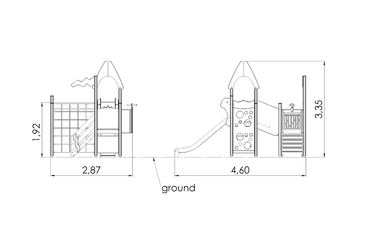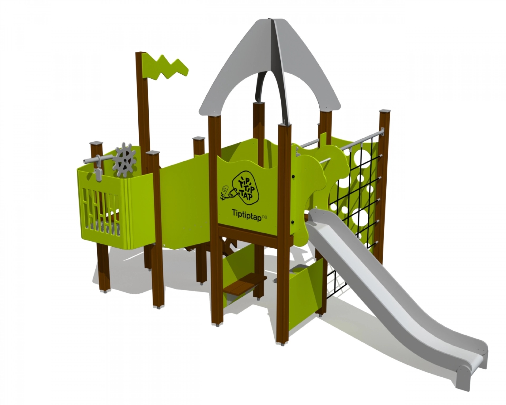 Žaidimų centras su trimis platformomis, laiptais su turėklais, laipiojimo tinklu, čiuožykla, skersiniu ir laipiojimo sienele su skylėmis. Žiūronai, kapitono vairas ir žaidimų kampelis su suoliuku, kuriame įrengti virtuvės arba automobilio prietaisų skydelio elementai, patenkina vaidmenų žaidimų poreikius. Žaidimų centro šoninius skydelius galima keisti įvairiomis veiklos sienelėmis arba teminiais spausdintiniais skydeliais (gyvūnai, paukščiai, žuvys, medžiai, uogos ir t. t.). Skydų dizainas bus galutinai suderintas su klientu užsakymo metu.