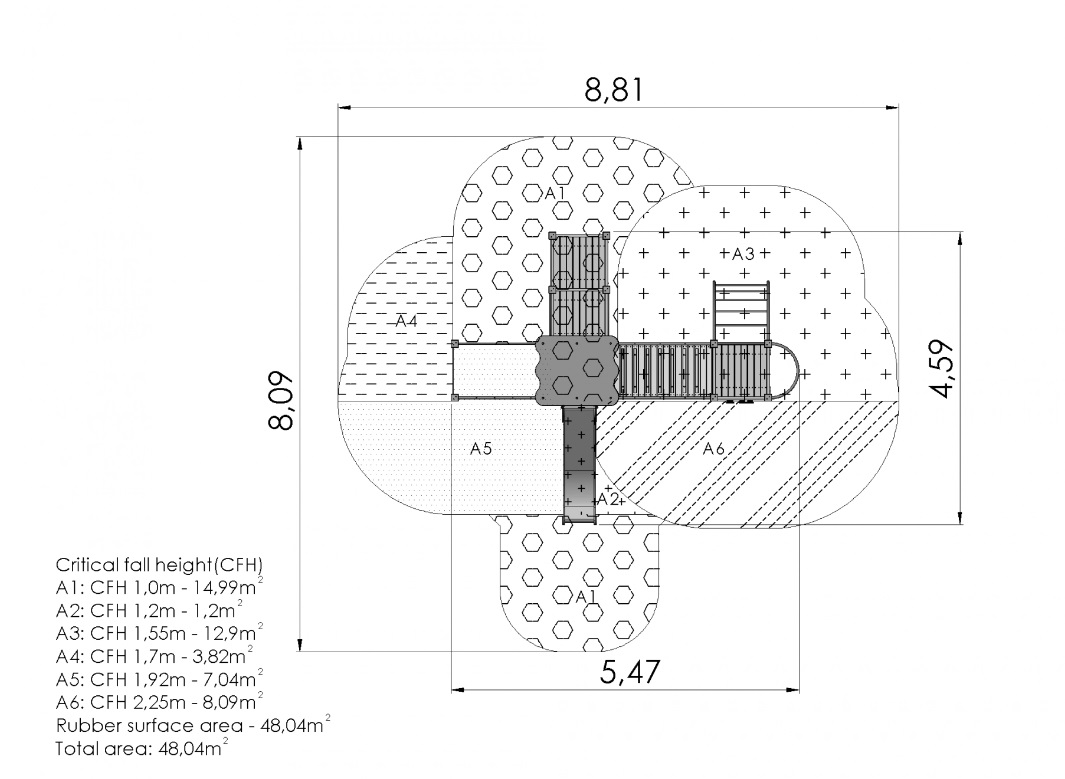 Žaidimų centras su keturiomis platformomis, tiltu, laipiojimo tinklu, kalneliu, laipiojimo sienele, ugniagesių stulpu ir arkinėmis kopėčiomis. Į žaidimų centrą galima patekti nuo apatinės platformos. Žaidimų centre yra kapitono vairas ir žaidimų kampelis su suoliuku, kuriame galima įrengti virtuvės arba automobilio prietaisų skydelio elementus. Į aukštesnę platformą galima patekti tilteliu arba arkinėmis kopėčiomis, o gaisrininkų stulpas suteikia galimybę lengvai nusileisti žemyn. Žaidimų centro šoninius skydelius galima keisti įvairiomis veiklos sienelėmis arba teminiais spausdintiniais skydeliais (gyvūnai, paukščiai, žuvys, medžiai, uogos ir t. t.). Skydų dizainas bus galutinai suderintas su klientu užsakymo metu.