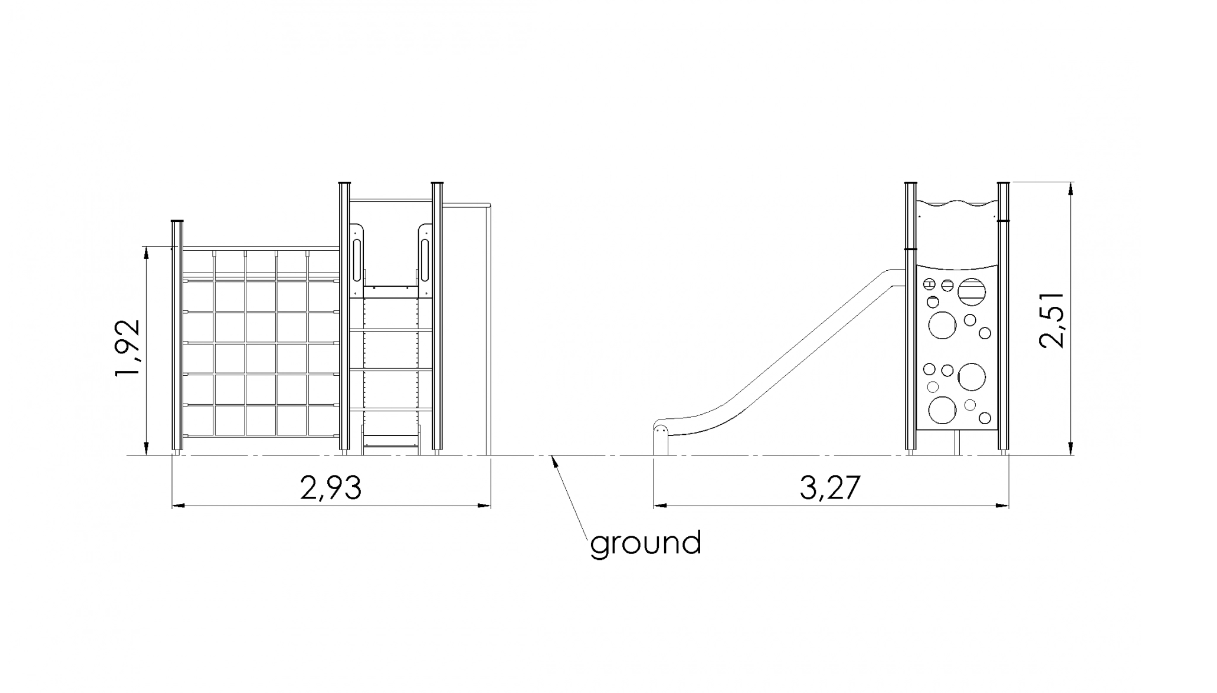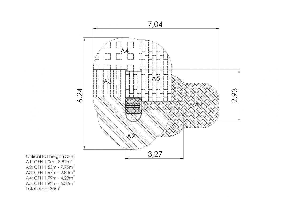 Žaidimų centras su platforma, nusileidimo kalneliu, skersiniu, laipiojimo sienele su skylėmis ir tinkline laipiojimo sienele. Į platformą veda mažos kopėčios, o į apačią – čiuožykla ir ugniagesių stulpas. Žaidimų centro šoninius skydelius galima keisti į įvairias veiklos sieneles arba teminius spausdintus skydelius (gyvūnai, paukščiai, žuvys, medžiai, uogos ir t. t.). Skydų dizainas bus galutinai suderintas su klientu užsakymo metu.