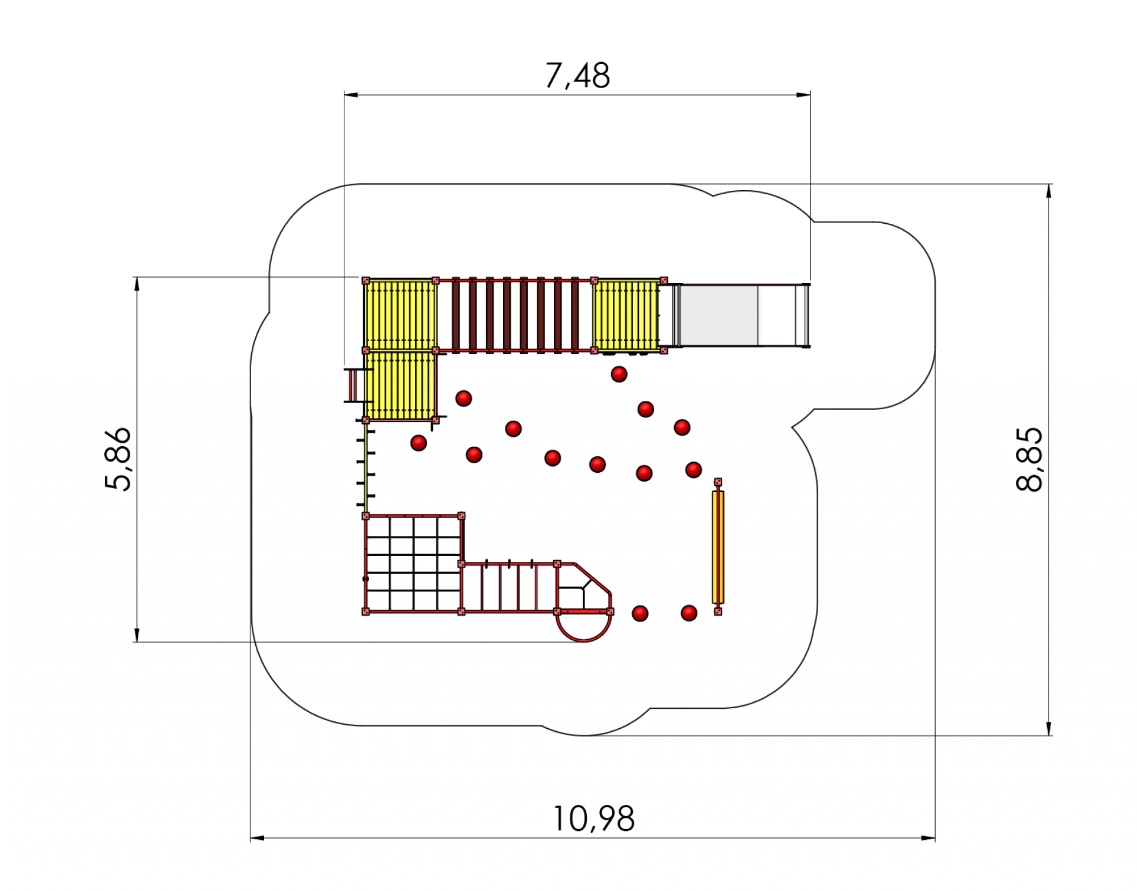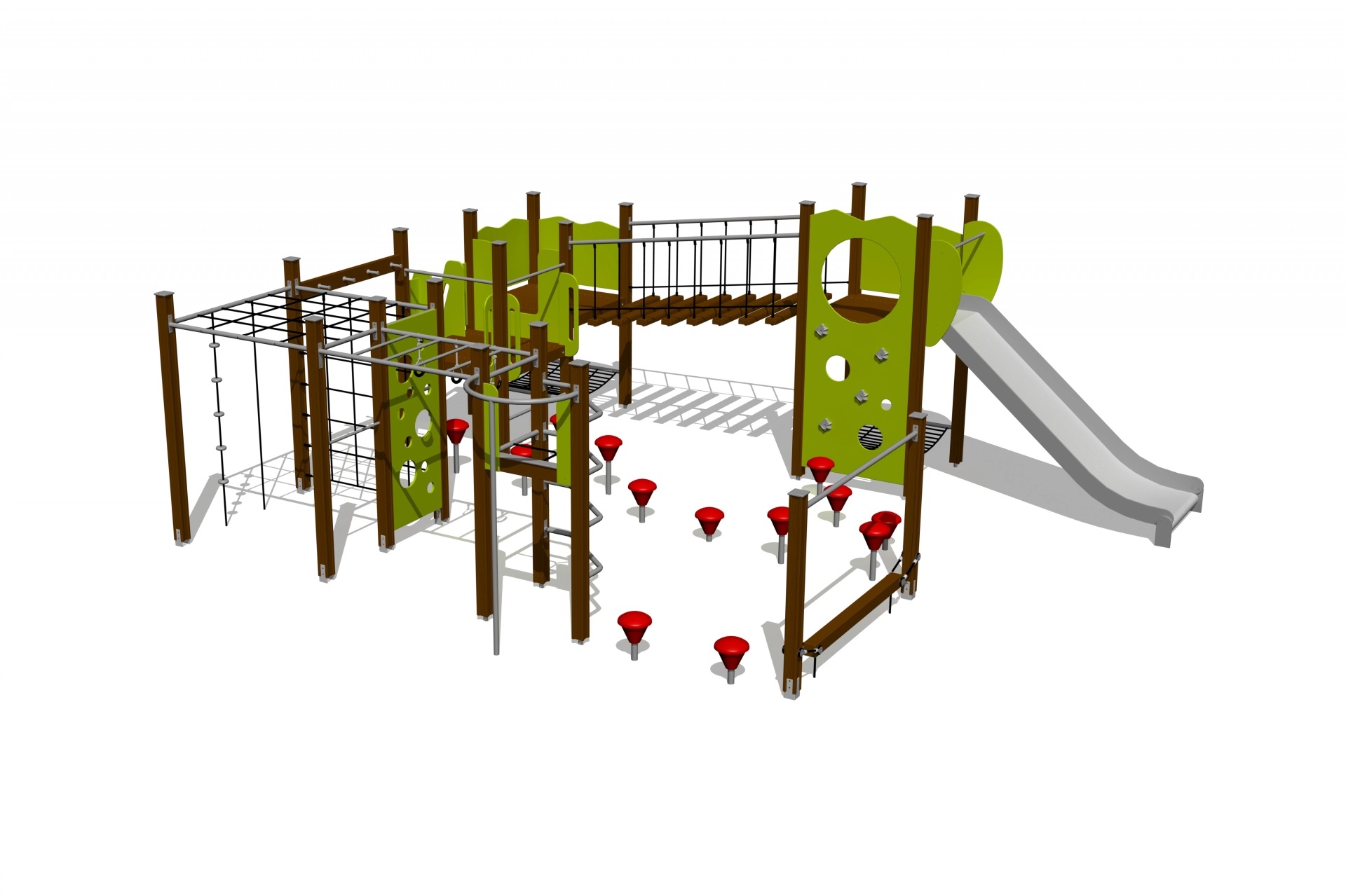 Šis smagus ir universalus žaidimų centras patenkina visus laipiojimo poreikius ir siūlo daugybę būdų lavinti vikrumą, jėgą, drąsą ir pusiausvyros įgūdžius. Skirtingomis kopėčiomis galima patekti į tris platformas. Dvi platformas jungia pusiausvyros tiltelis su judančiais laipteliais, o po jais yra du tinklai supynėms. Centre siūloma mankštos įranga, padedanti lavinti vikrumą, jėgą, pusiausvyrą ir koordinaciją (horizontali ir vertikali tinklo siena, horizontalios kopėčios, beždžionių barai su rankenomis, laipiojimo sienelė su skylėmis, kelios laipiojimo virvės, slankiojanti pusiausvyros sija ir pusiausvyros stovai). Ypač platus kalnelis ir ugniagesių stulpas suteikia galimybę nusileisti žemyn.