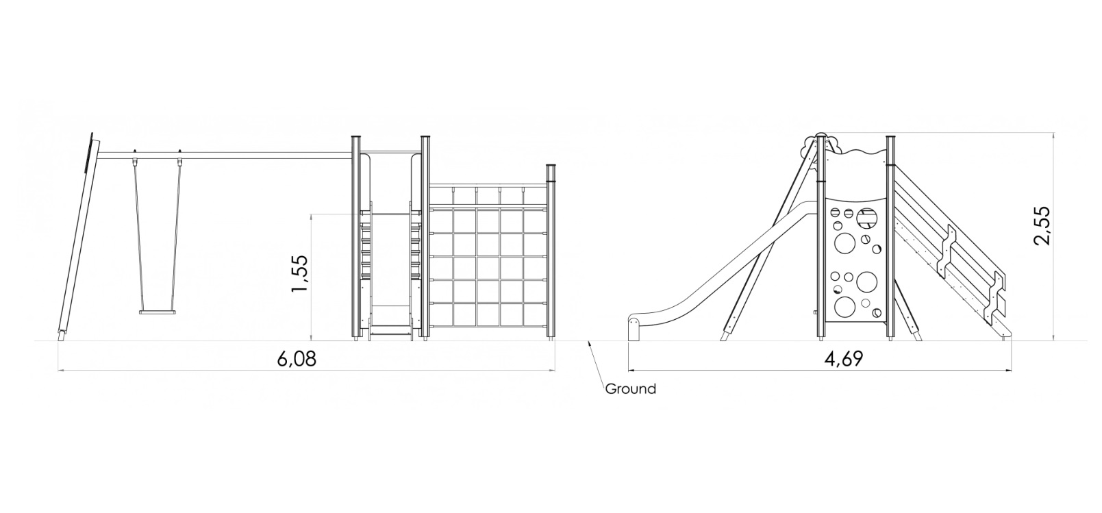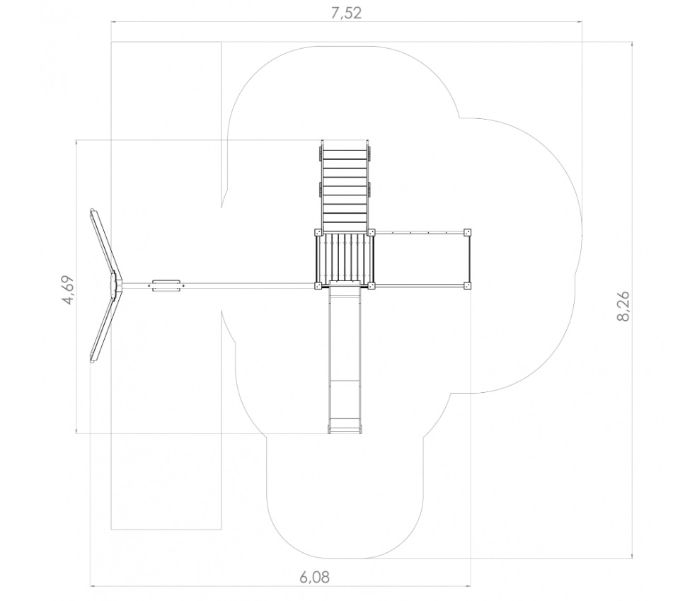 Žaidimų centras su platforma, čiuožykla, įvairiais laipiojimo elementais ir sūpynėmis. Į centrą veda laiptai su turėklais. Integruotame laipiojimo komplekse, kuriame yra kelios tinklinės sienos, laipiojimo sienelė su skylėmis ir laipiojimo virvės, galima lavinti ir laipiojimo įgūdžius, ir vikrumą. Žaidimų kampelis su automobilio prietaisų skydeliu ar virtuvės elementais patenkina vaidmenų žaidimų poreikius. Žaidimų centro šoninius skydelius galima keisti įvairiomis veiklos sienelėmis arba teminiais spausdintiniais skydeliais (gyvūnai, paukščiai, žuvys, medžiai, uogos ir t. t.). Skydų dizainas bus galutinai suderintas su klientu užsakymo metu.