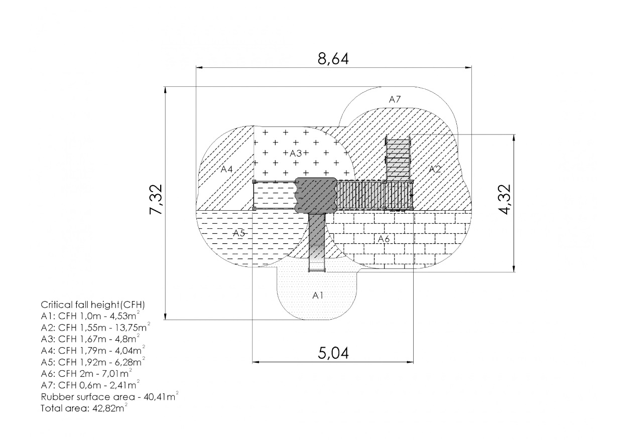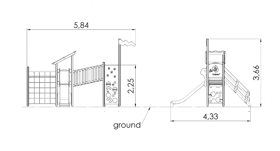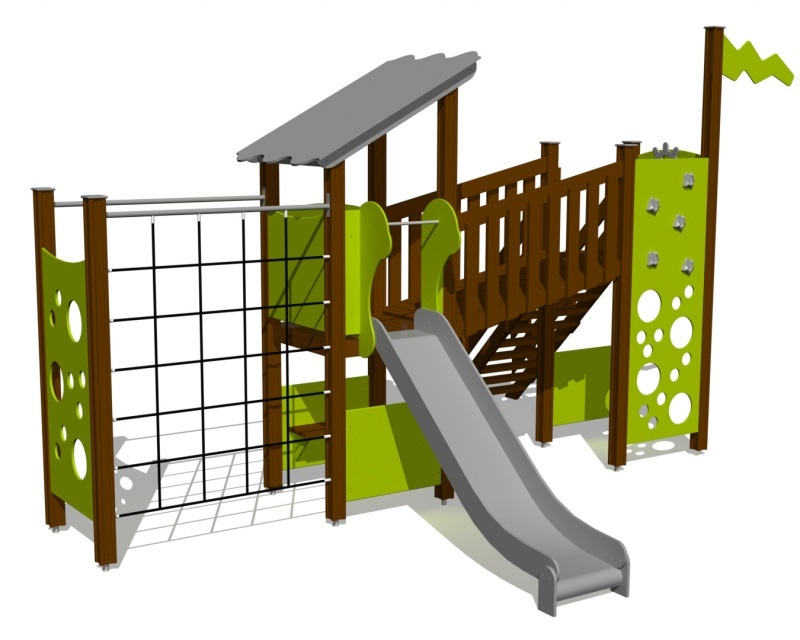 Žaidimų centras su dviem platformomis ir įvairiais laipiojimo elementais. Laiptai su turėklais veda į platformą, kuri su kitomis platformomis sujungta saugiu nuožulniu tilteliu. Dvi skirtingo sudėtingumo laipiojimo sienelės ir virvių tinklas padeda lavinti vikrumo įgūdžius. Ant platformos su nuožulniu stogu įrengtas nusileidimo kalnelis. Papildomo smagumo suteikia kapitono vairas, veiklos skydelis ir smagus žaidimų kampelis su suoliuku, kuriame galima įrengti virtuvės ar automobilio prietaisų skydelio elementus. Žaidimų centro šoninius skydelius galima keisti įvairiomis veiklos sienelėmis arba teminiais spausdintiniais skydeliais (gyvūnai, paukščiai, žuvys, medžiai, uogos ir t. t.). Skydų dizainas bus galutinai suderintas su klientu užsakymo metu.