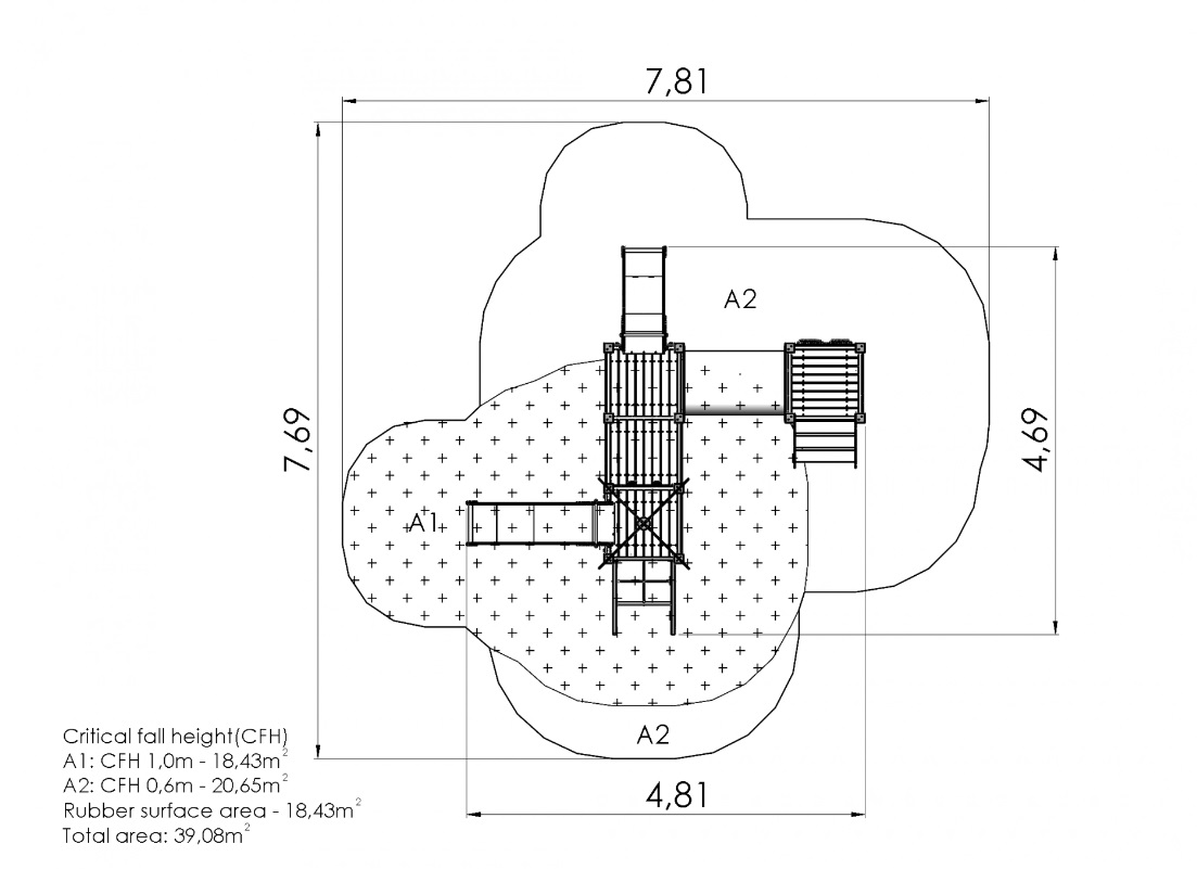 Žaidimų centras su keturiomis platformomis, tuneliu ir dviem čiuožyklomis. Laiptai su turėklais veda į apatinę platformą, kurioje įrengtas veiklos skydelis. Šliaužimo tunelis veda į kitą platformą, kurioje yra nusileidimo kalnelis. Nuožulnus tinklo tiltas veda į aukštesnę platformą su stogeliu, kur kitas nusileidimo kalnelis suteikia galimybę nusileisti žemyn. Žaidimų centro šoninius skydelius galima keisti įvairiomis veiklos sienelėmis arba teminiais spausdintiniais skydeliais (gyvūnai, paukščiai, žuvys, medžiai, uogos ir t. t.). Skydų dizainas bus galutinai suderintas su klientu užsakymo metu.