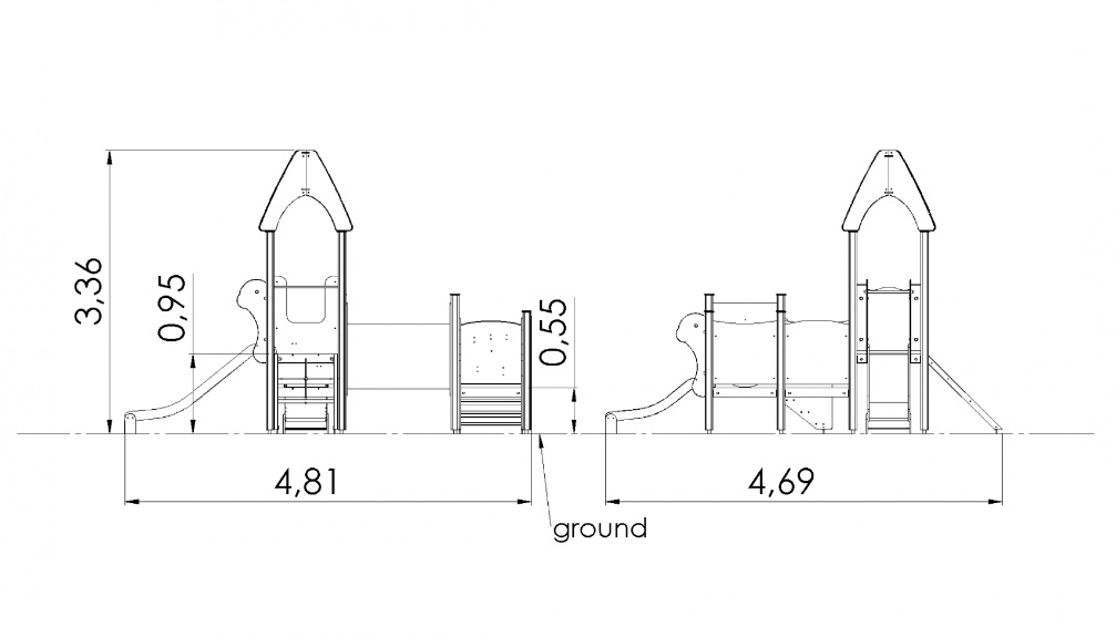 Čiuožykla: 2 vnt. 1,55 m ir 0,95 m aukščio. Nerūdijančio plieno, HDPE plastiko šonai