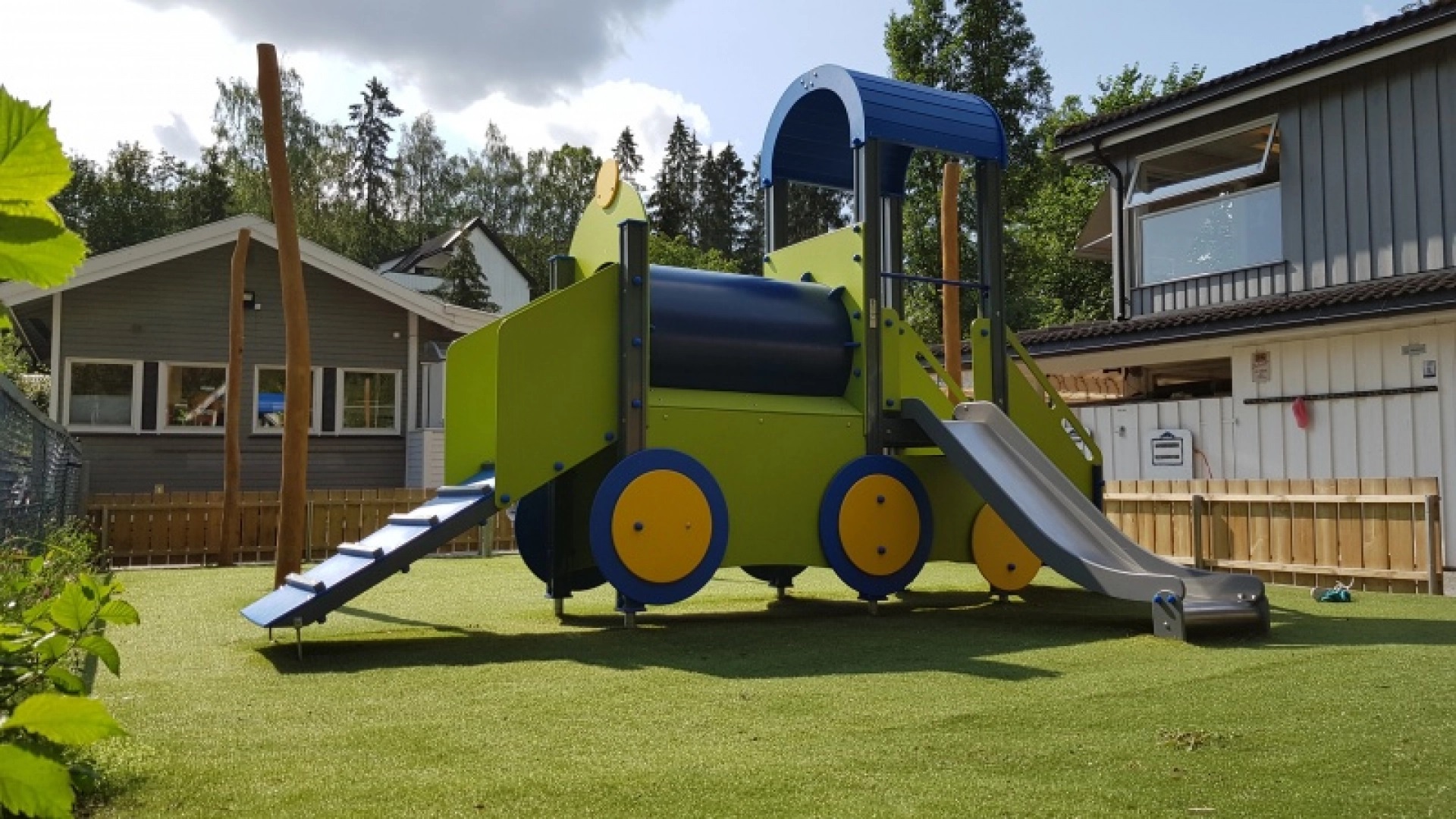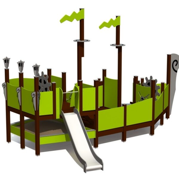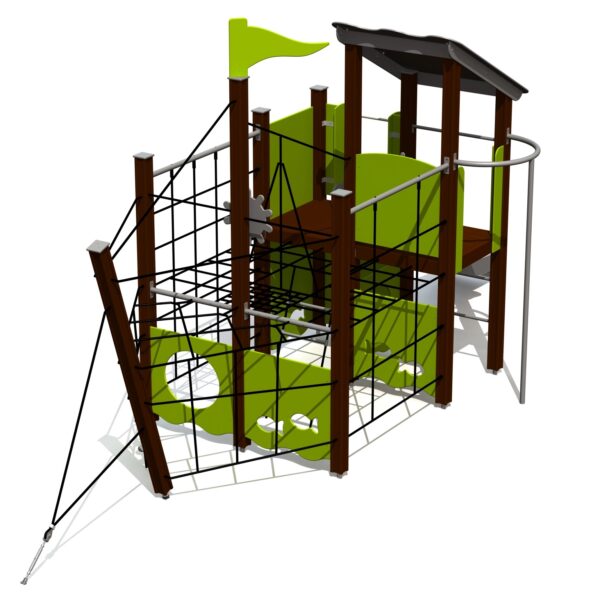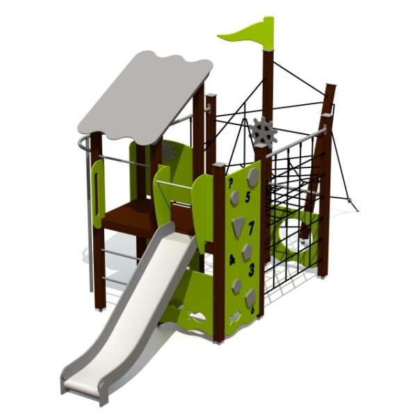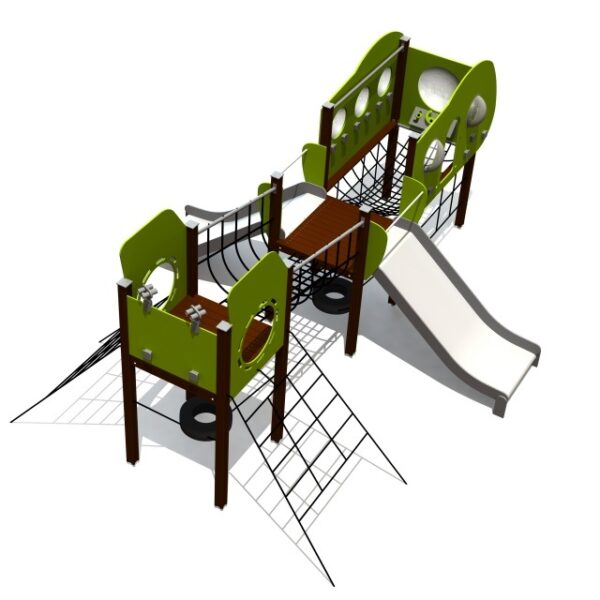 Žaidimų traukinukas su čiuožykla skirtas mažiems vaikams. Vaikai gali patekti į platformą naudodamiesi laiptais su dvigubais turėklais arba eidami rampa su mediniais laipteliais ir ropodami tuneliu. Prie platformos pritvirtinta 0,95 m aukščio čiuožykla.