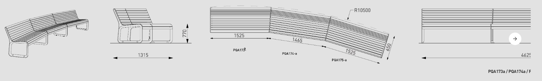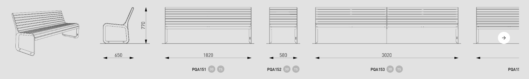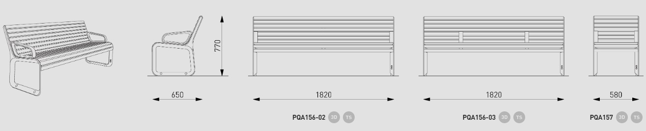 Sēdvieta no 10 dēļiem: 1800 x 30 x 40 mm – 8 gab., 1800 x 32 x 40 mm – 2 gab. (ar noapaļotām malām). Atzveltne no 7 dēļiem: 1800 x 30 x 40 mm – 6 gab., 1800 x 30 x 45 mm – 1 gab. Sola izmēri: 1820 x 650 x 770h mm., augstums līdz sēdvietai 431 mm. Izstrādājuma svars 46 kg.