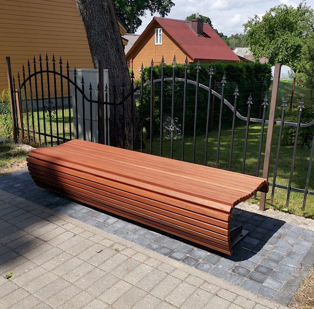 Dēļu izmēri 1800 / 2000x40x35(mm) – 23gab. Tērauds 6mm karsti cinķots un krāsots ar pulvera nokrāsu. Koksne tropu cietā koksne, eļļota