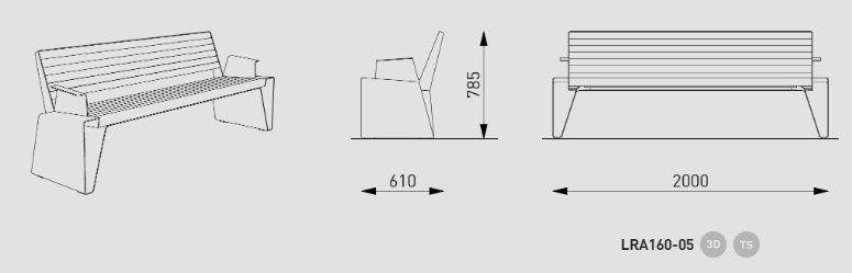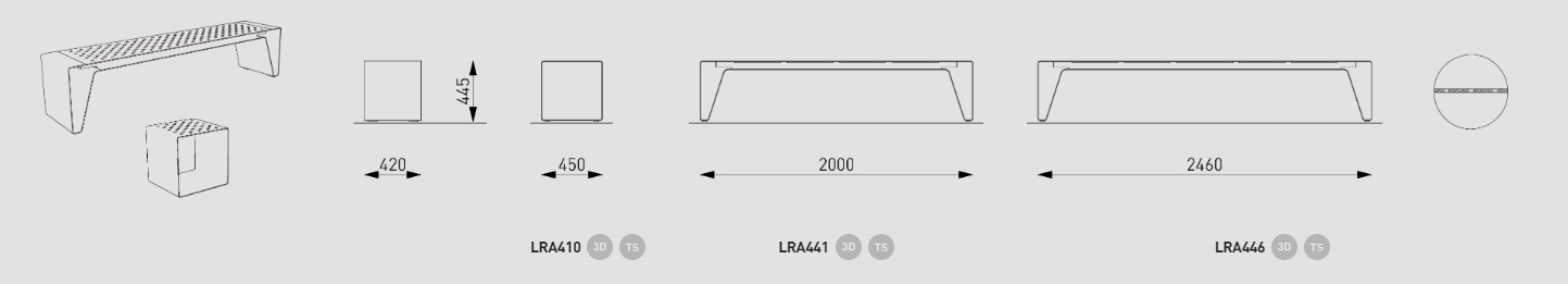 Materiāli: Sola konstrukcija izgatavota no cinkotas tērauda loksnēm, krāsotas pulvera metodē. Sēdvieta var būt no tērauda loksnes, koka dēļiem vai augstas spiediena laminātbērlīņa (HPL) plāksnēm. Var kombinēt ar citiem Radium sērijas produktiem. Piedāvājas sešu krāsu kombinācijas.