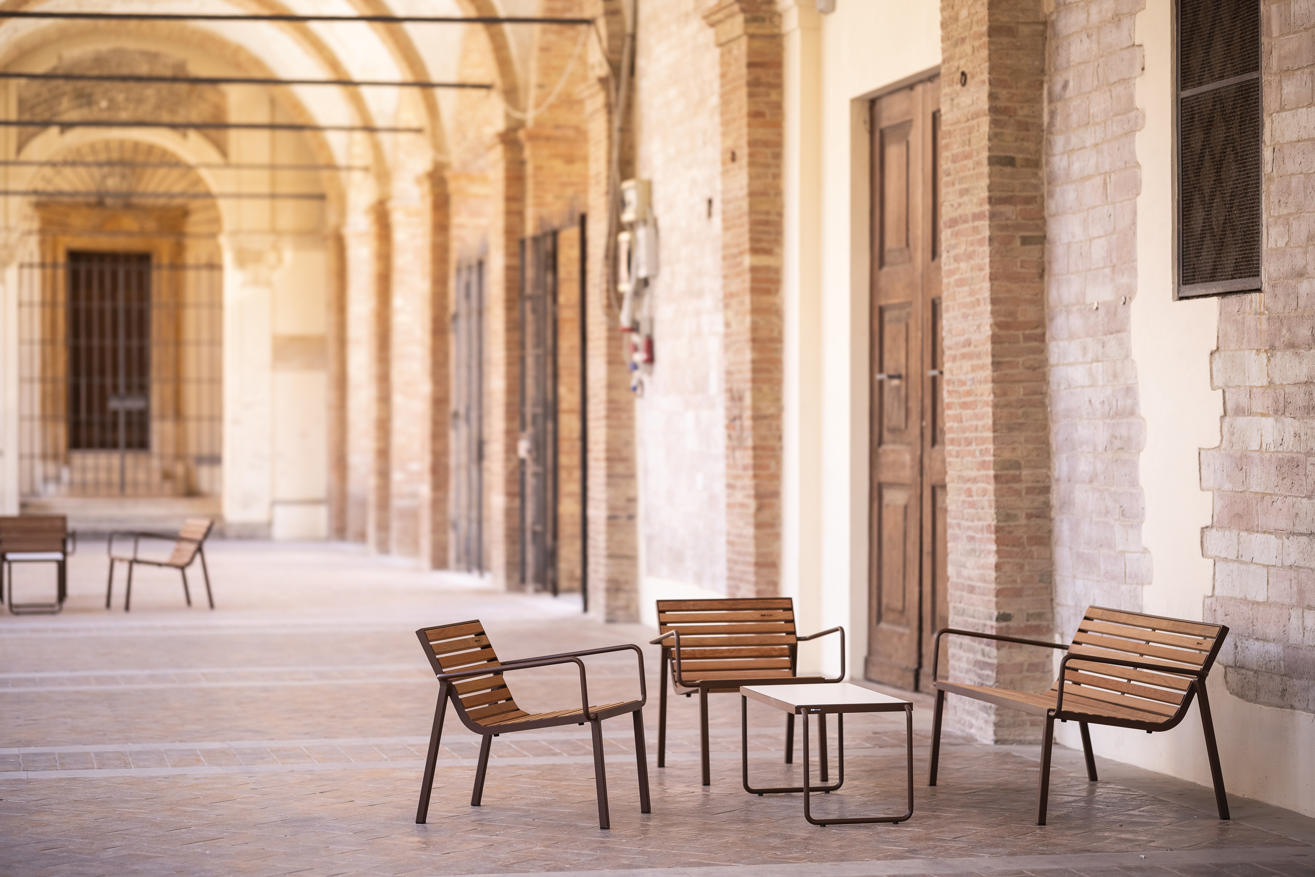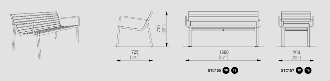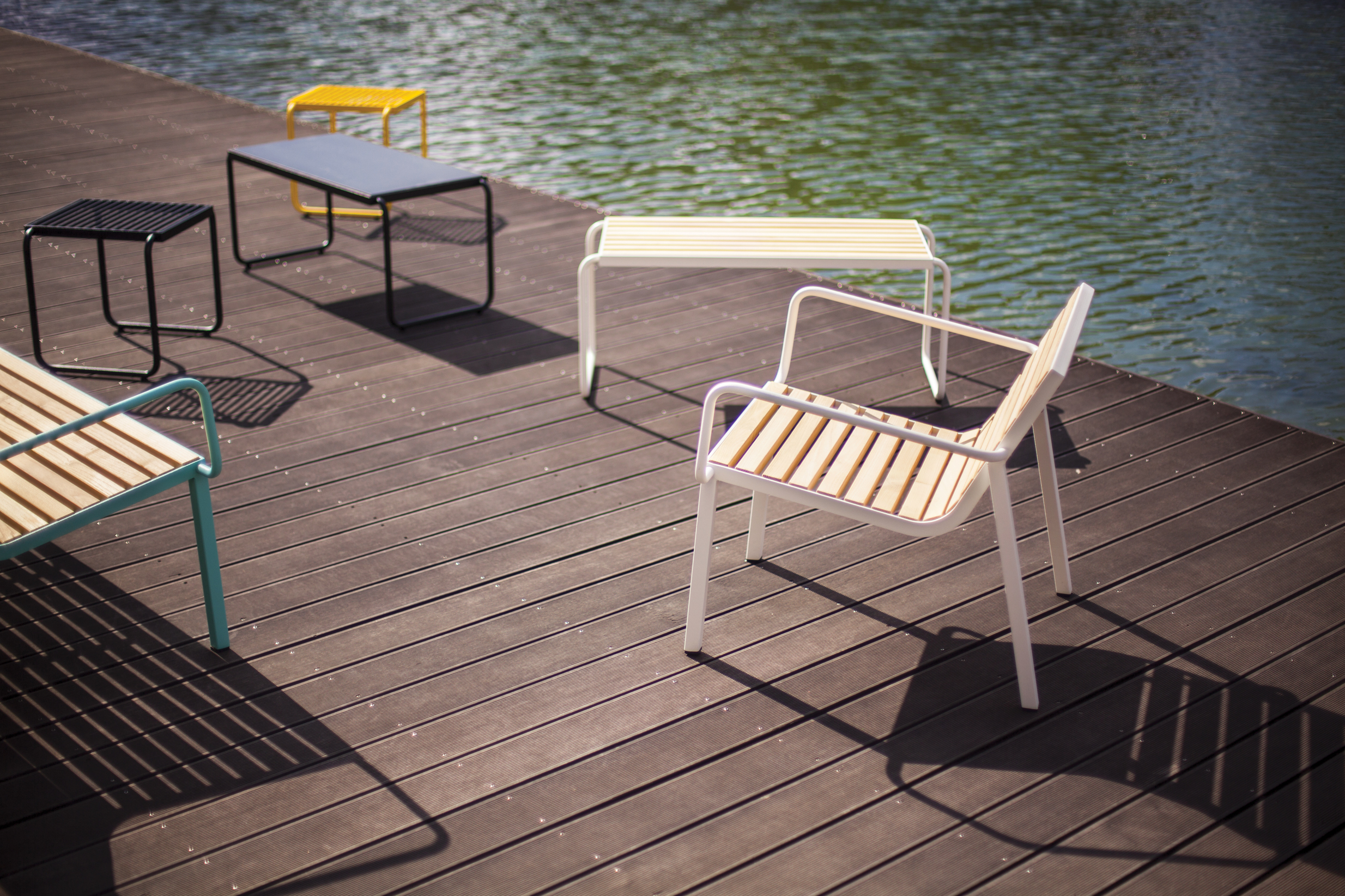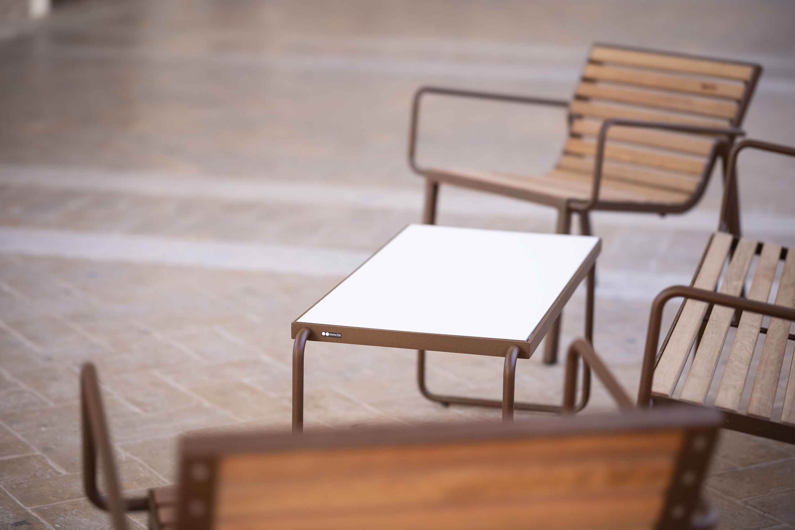 Lengva cinkuoto plieno konstrukcija padengta milteliniu būdu, sėdynės pagamintos iš medinių lentų arba plieno, stalviršiai ir kėdės gali būti padengti HPL. Laisvai stovinčios arba ant paviršiaus montuojamos versijos.