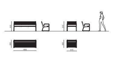 Matmenys: 1865×645 mm, H 810 mm, h 434 mm (47kg) arba 815×645 mm, H 810 mm, h 434 mm (26kg).