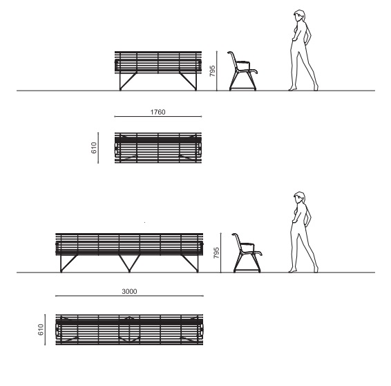Matmenys: 1760×610 mm, H 795 mm, h 432 mm (55kg) arba 3000×610 mm, H 795 mm, h 432 mm (87kg)