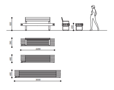 Matmenys: 2200×480 mm, H 450 mm (105kg); 3000×480 mm, H 450 mm (140kg); 2200×520 mm, H 850 mm, h 450 mm (125kg)
