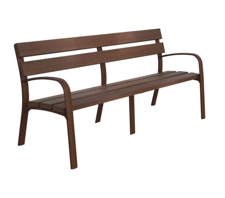 „Ecocity“ WPC suoliukas su porankiu. Matmenys: 1800x680xh830mm. Aprašymas: EcoCity suoliukas su 5 lentomis iš 100 % perdirbtos plastiko. Viso 3 kojos.