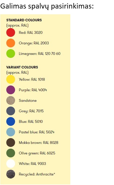 6-7 mm storio, dažytas, rotaciniu būdu suformuotas polietilenas. Atsparus ultravioletiniams spinduliams, atsparus oro sąlygoms, nusidėvėjimui. Medžiaga tinkama granuliuoti ir perdirbti. Dėl abrazyvinio formos šlifavimo, gaminių paviršius yra tekstūruotas/granuliuotas ir tampa mažiau slidus.