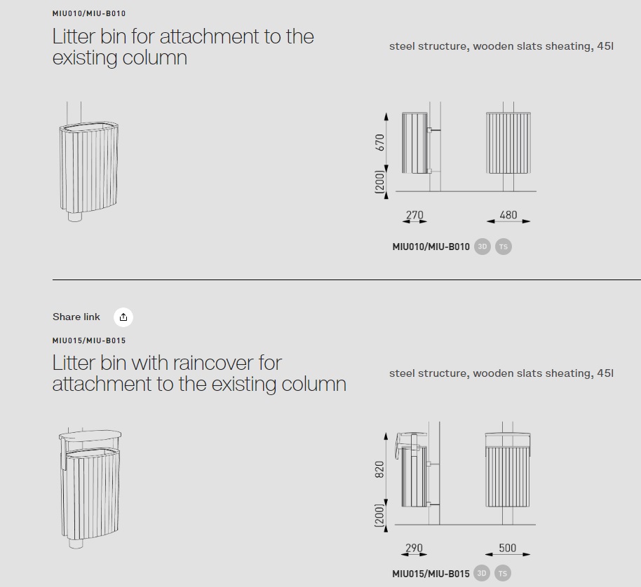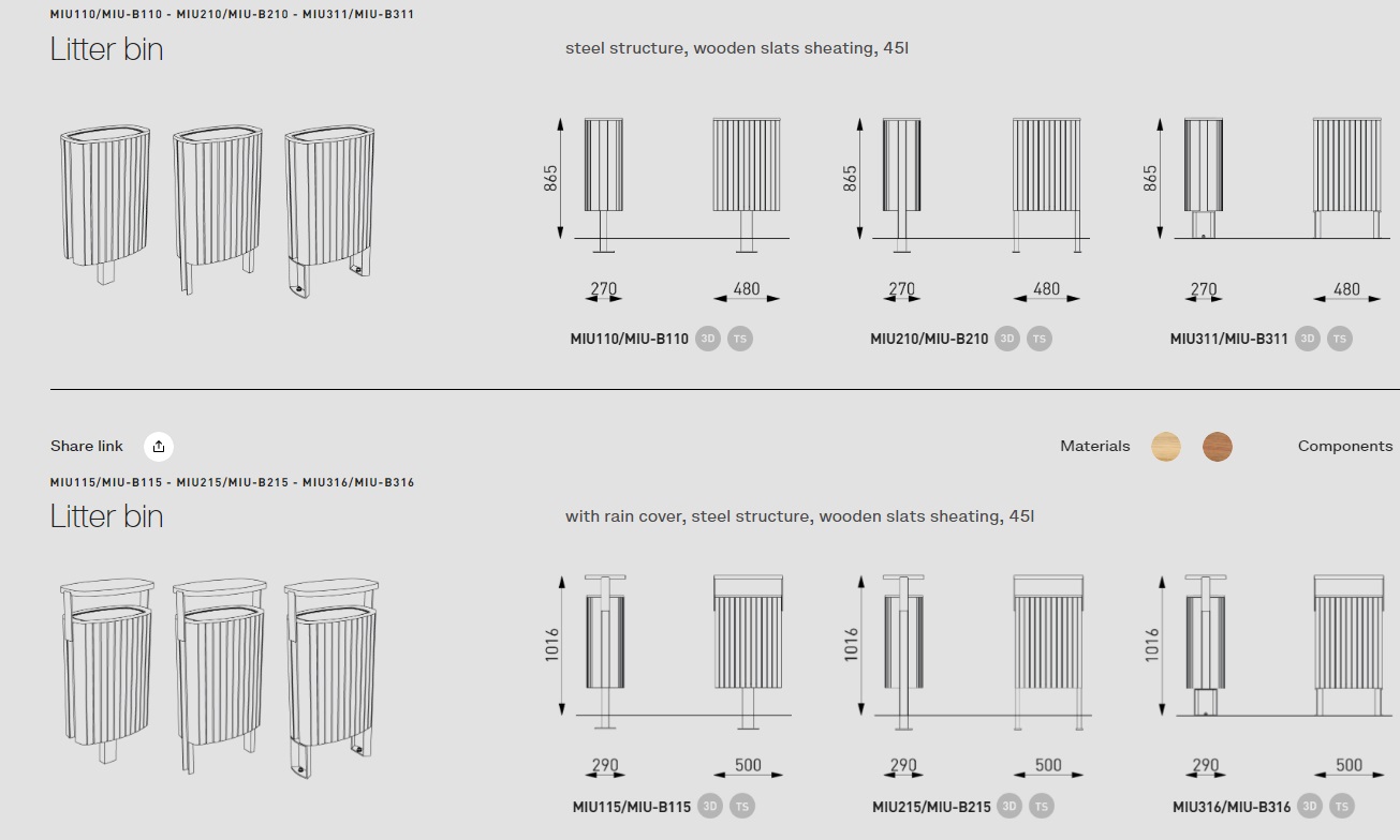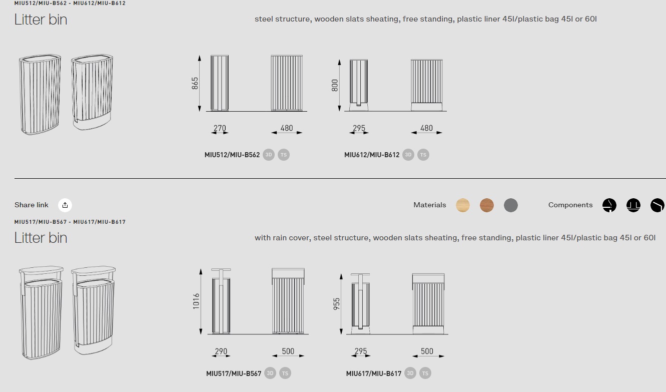 Atkritumu tvertnes rāmis izgatavots no cinkota tērauda. Apdare – tropu cietā koka (jatoba) vai akācijas koka plāksnes. Augšējais gredzenveida apkakls un jumts tiek lieti no alumīnija un krāsoti pulvera paņēmienā.