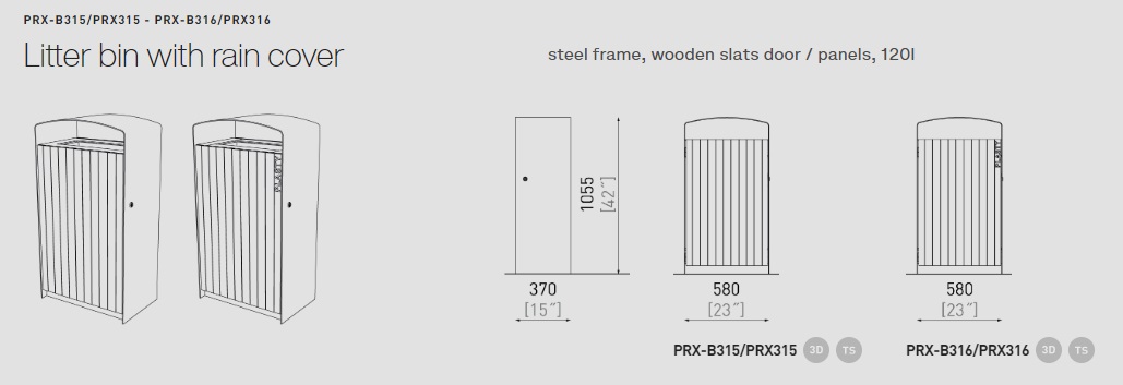 Āra atkritumu konteineri PRAX. Kods PRX315tr ar jumtu un koka apdarēm. Aizslēgts. Vandāļu izturīgs.