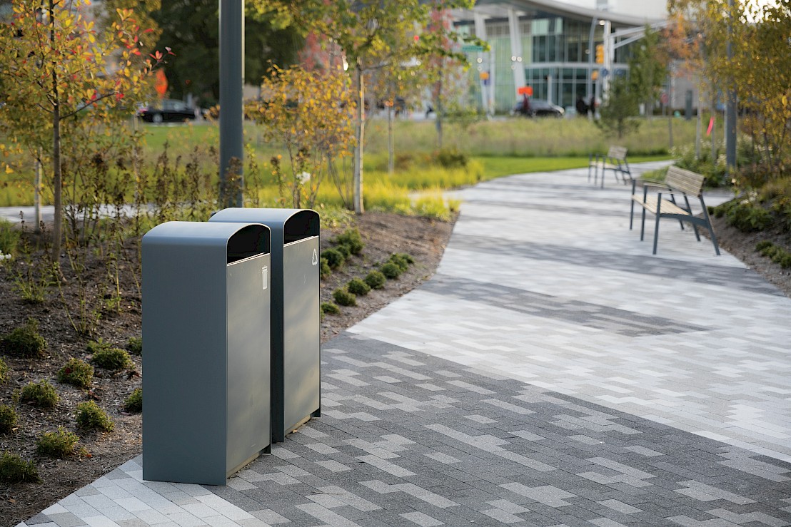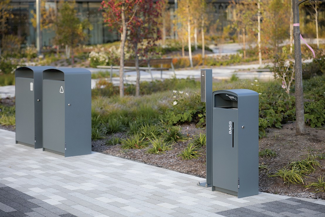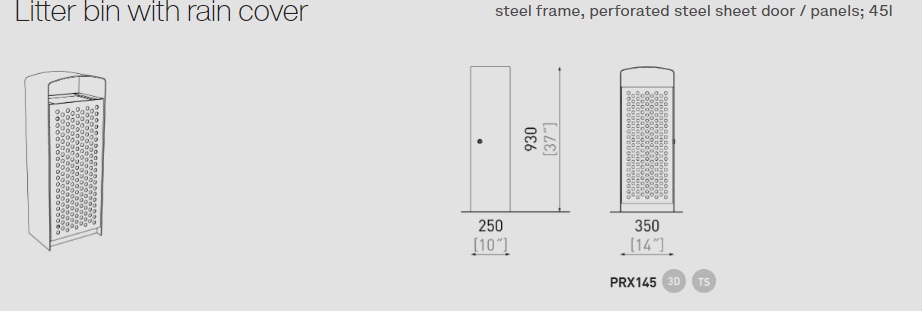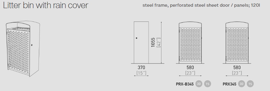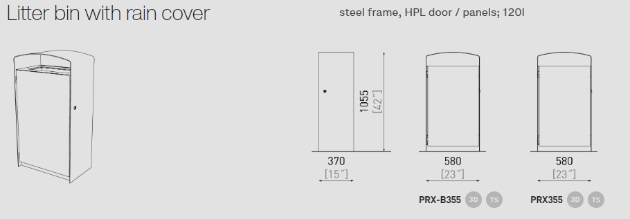 Cinkotā tērauda rāmis krāsots ar pulveri. Durvis var būt no koka dēļiem, perforēta tērauda vai augstas spiediena lamināta (HPL). Atkritumu maisa turētājs var būt no cinkota vai nerūsējošā tērauda. Tērauds ir cinkots 50–80µm biezumā un krāsots ar pulveri, kura biezums 80–120μm.