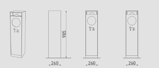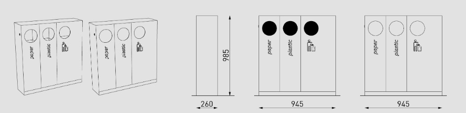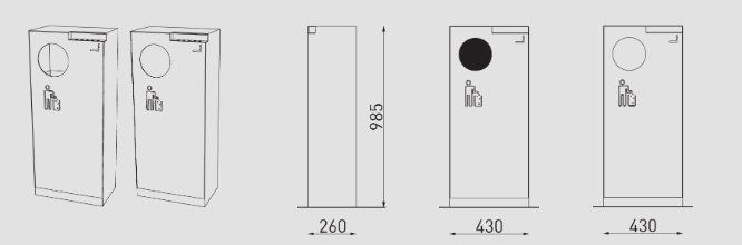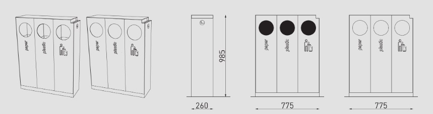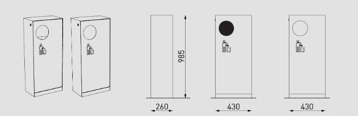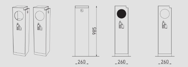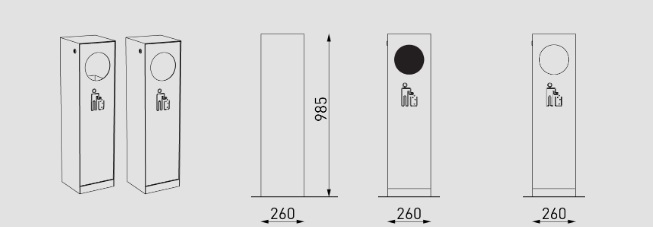 Cinkuoto plieno konstrukcija apdorota milteliniu būdu, rakinamos durelės, cinkuotas įdėklas. Alternatyviai su nerūdijančio plieno pelenine. Montuojama ant paviršiaus. Aktualią daugumos šiuolaikinių miestų problemą išsprendžia “Crystal” modelis šunų atliekoms su integruota vieta specialiems maišeliams. Rūkaliams taip pat galima įsigyti peleninę.