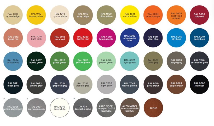 Cinkuoto plieno rėmas padengtas milteliniu dažų sluoksniu, galima derinti su medinėmis lentelėmis. Visada tvirtinamas ankeriais. Spalvos tiek korpuso, tiek stogelio gali būti skirtingos – pagal MMCite spalvų paletę.