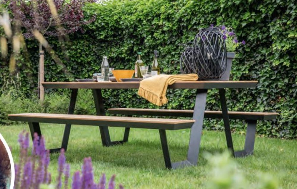 Pikniko rinkinys. Susideda iš 2 suolų ir 1 stalo. Konstrukcija iš dažyto aliuminio. Galimos spalvos RAL7024 arba RAL9007. Medžio kompozito WPC lentos. Sėdimosios dalys dvi po 2 lentas, stalas 6 lentos. Matmenys: 1800x1700x750h mm.