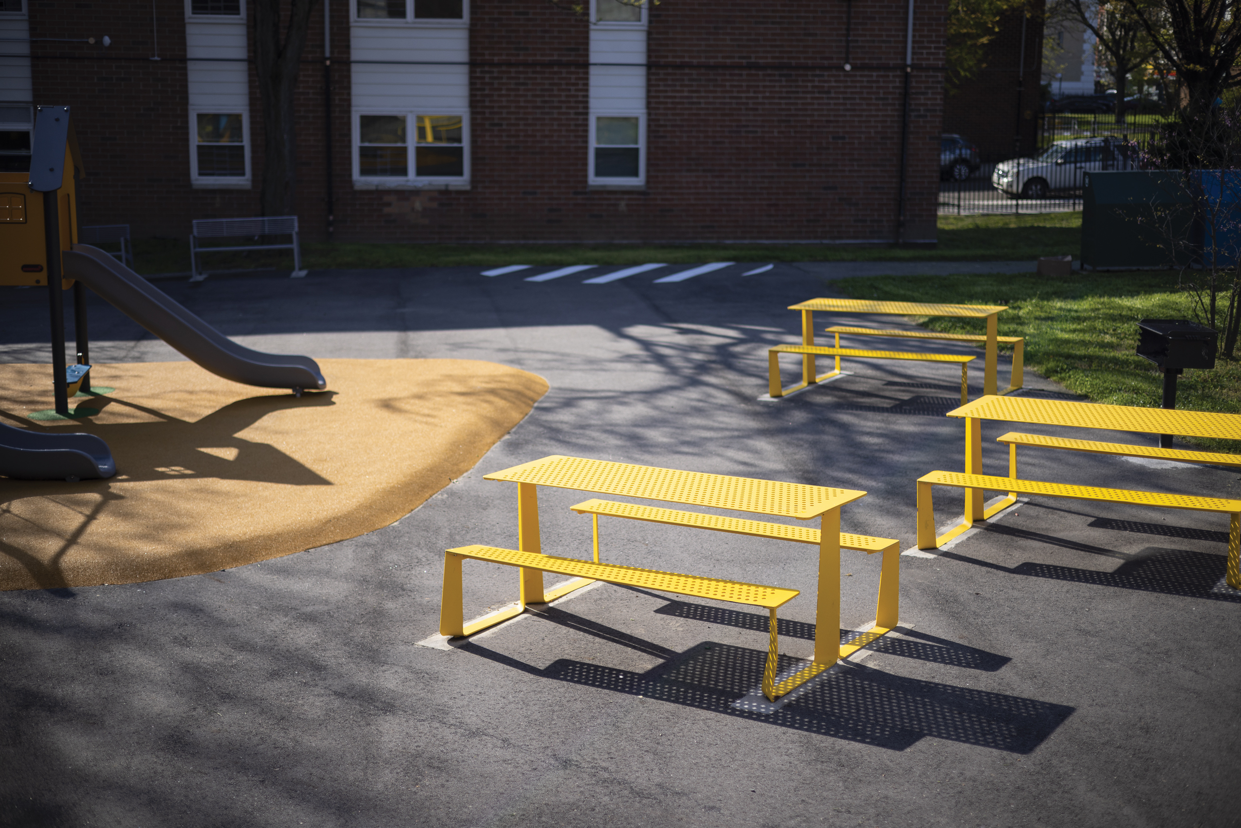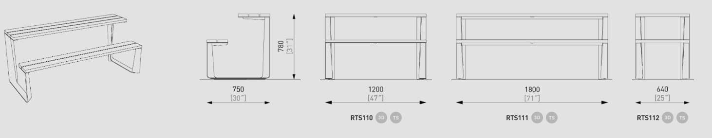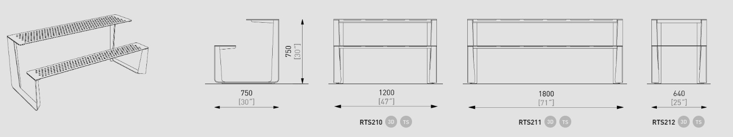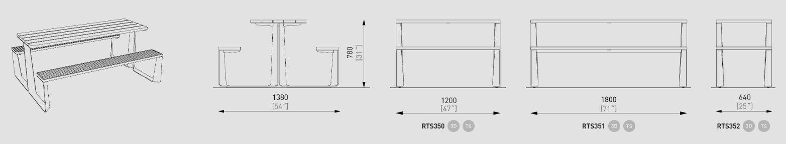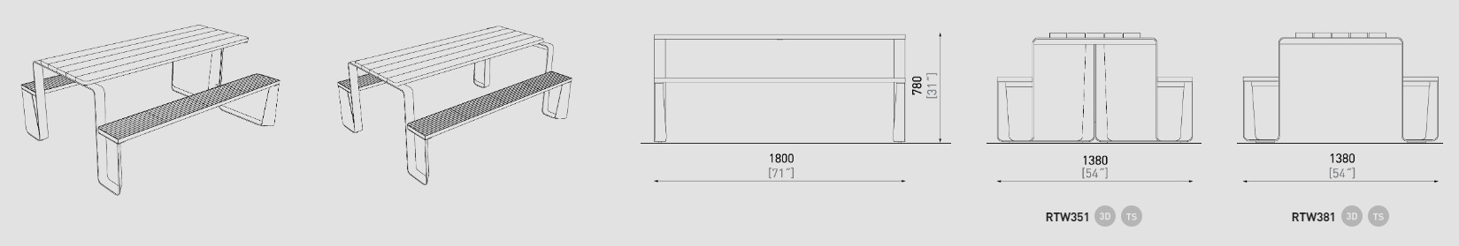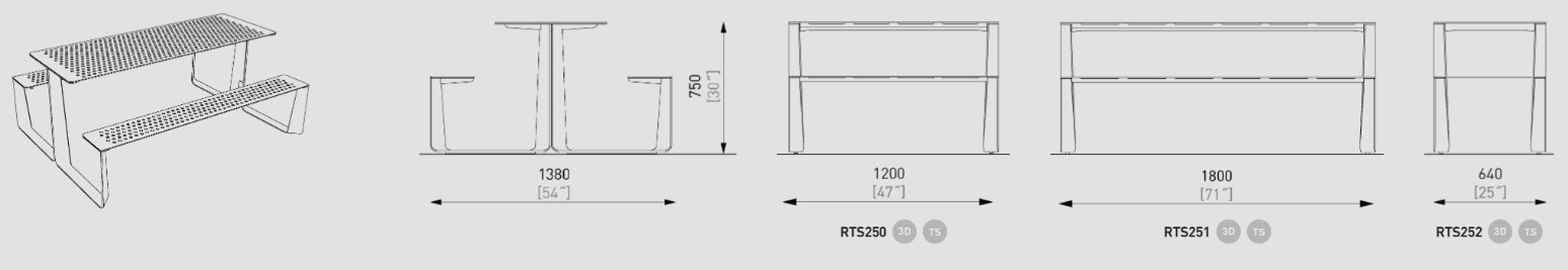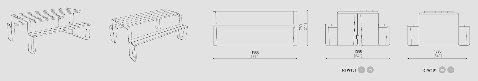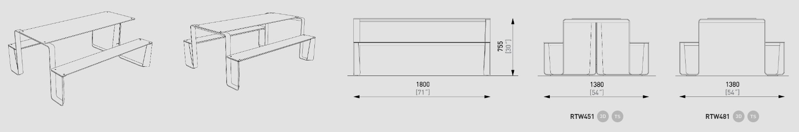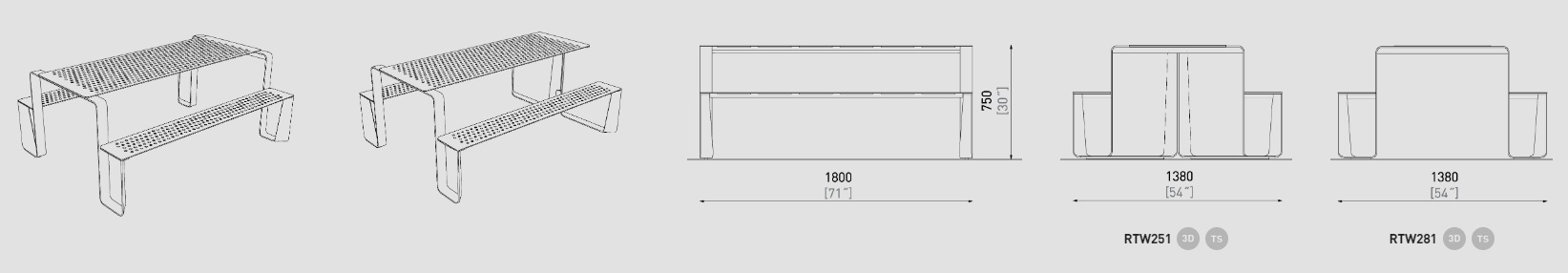 Stalas pagamintas iš cinkuoto ir dažyto plieno. Plieno klasė S235JR. Sėdimoji dalis ir stalas pagaminti iš medinių lentų, perforuoto plieno lakštų, plieninių apvalumų arba HPL. Montuojamas ant paviršiaus arba laisvai pastatomas.