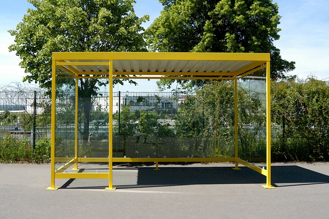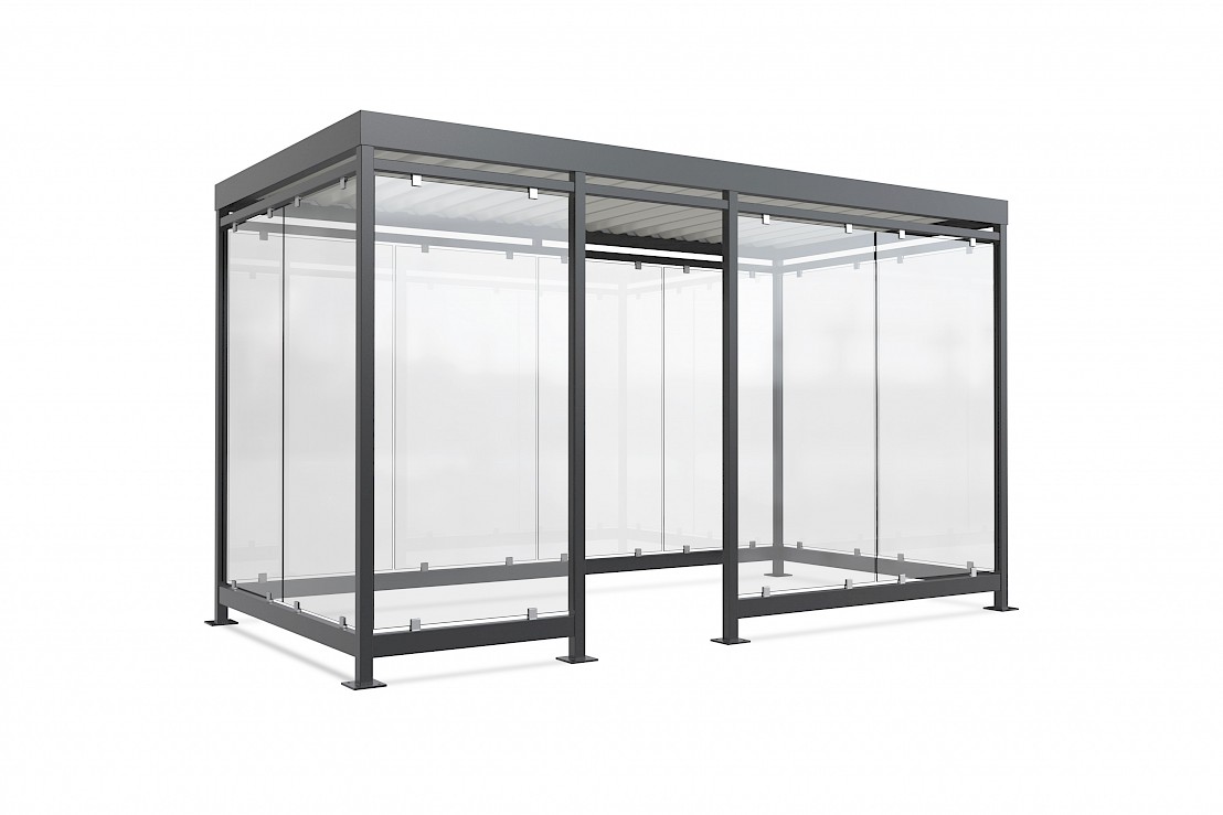 Pietura konstruēta no cinkota un krāsota, saskaņā ar RAL paleti, tērauda. Kalibrētā stikla sienas. Profilēta metāla loksne horizontālais jumts. Iespējams stikla pārklājums ar uzlīmēm. Iespiedams pamatiem. Lietus ūdens noteces caur aizmugurējām kājām. Iespējams dažāds sienu izvietojums.
