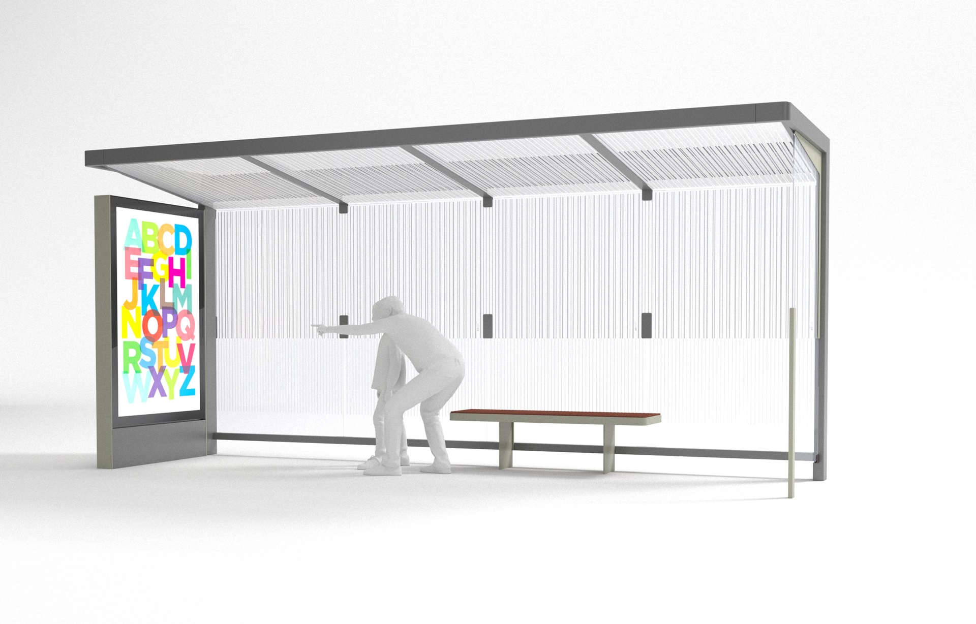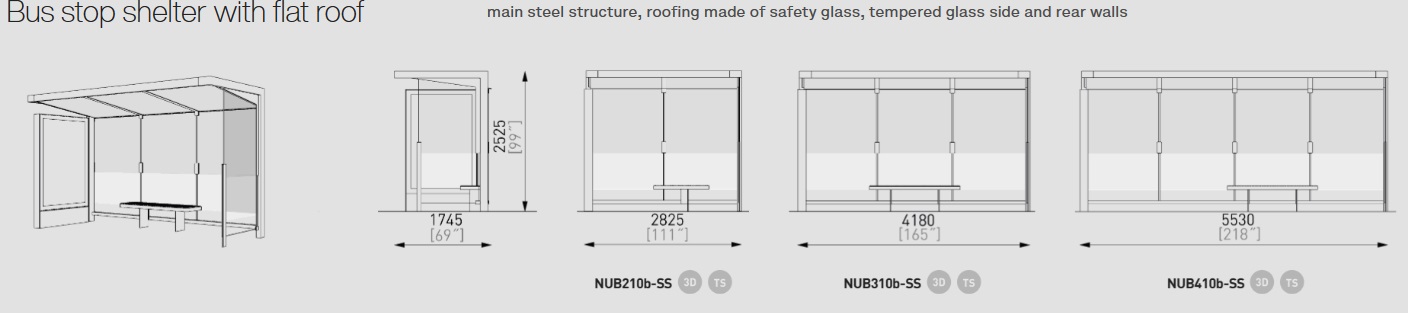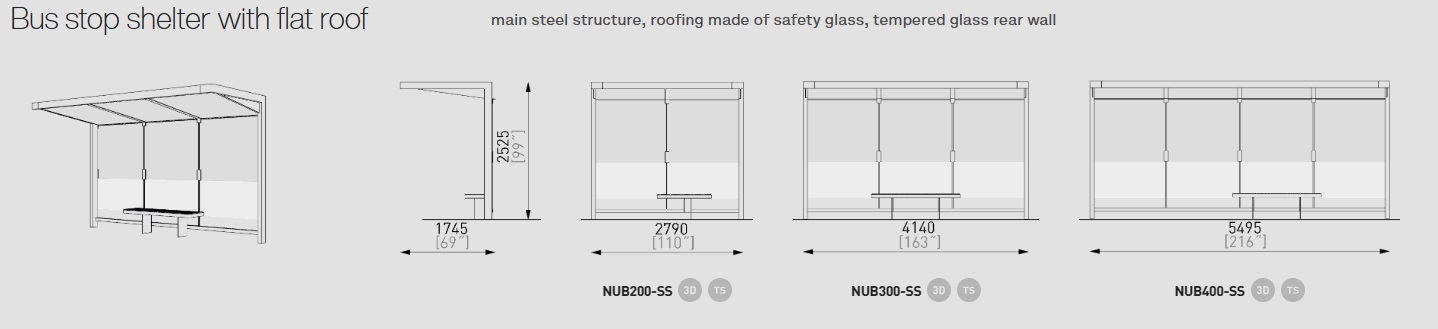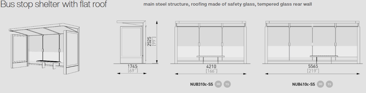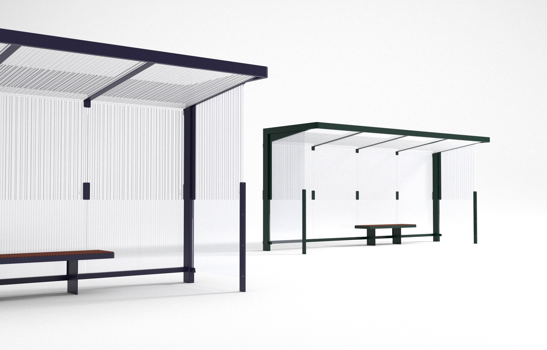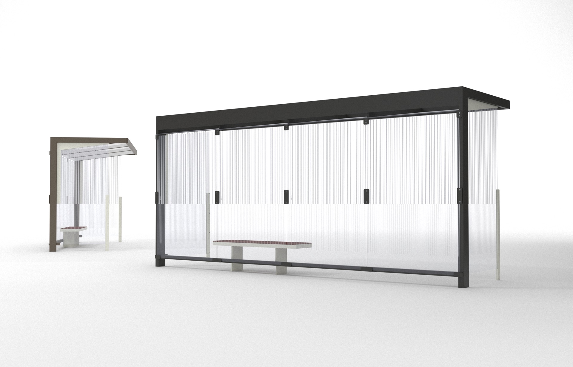 Ši moderni stiklinė stoginė – stilingas ir funkcionalus bet kurios miesto aplinkos priedas. Visiškai stiklinį paviršių supa plieno konstrukcija su subtiliai užapvalintais kampais, kuri sukuria elegantišką ir minimalistinę estetiką. Pieno spalvos stogas sklandžiai apsaugo nuo saulės, o galimybė ant pastogės sienelių naudoti subtilią grafiką gali suteikti asmeniškumo. Galimos dviejų arba keturių kojų versijos, todėl pastogė tinka įvairioms vietoms, įskaitant tas, kuriose yra didesnė sniego ir vėjo apkrova. Dvipusė versija suteikia pastogę skirtingomis kryptimis važiuojantiems keleiviams. Joje integruotas suoliukas, kurio plieninę konstrukciją galima nudažyti ir suteikti pastogei spalvinį akcentą. Papildomos funkcijos – ant stogo įrengtos fotovoltinės plokštės ir USB jungtys prietaisams įkrauti.
