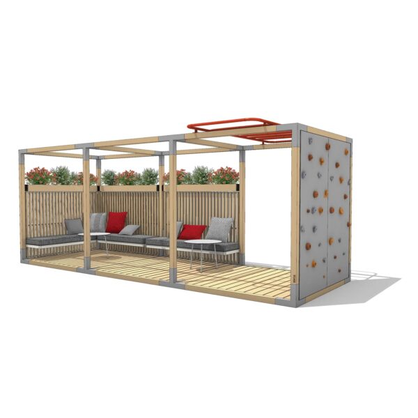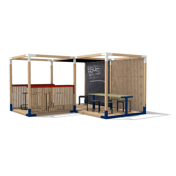 Į komplektą įeina: rėmas (LEV110); lubos iš medinių lentelių (LEV402); sienelė iš medinių lentelių su stalu (LEV464) ir medinės grindys (LEV500)