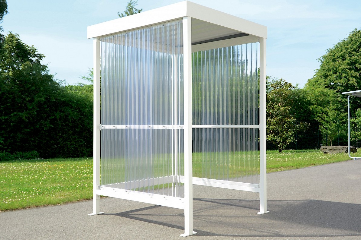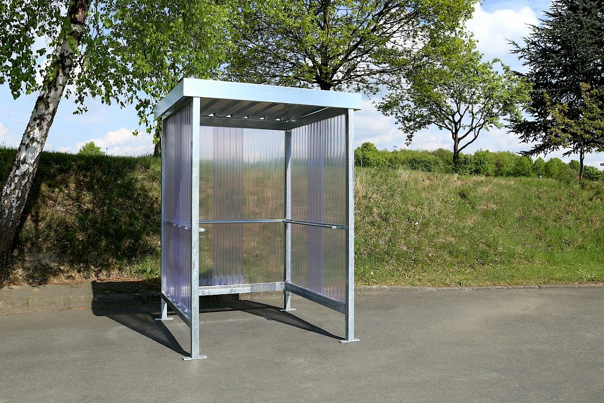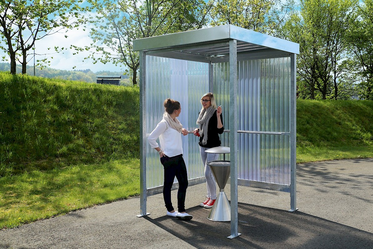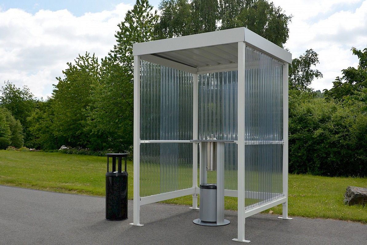 tā arī palīdz aizsargāt nesmēķētājus uzņēmumos, slimnīcās vai valsts iestādēs. Ekonomiska, karstā cinkota plakana jumta tērauda konstrukcija ir ar diviem vai, pēc izvēles, trim sānu elementiem (Jena K), kas izgatavoti no augstas kvalitātes riblota polikarbonāta ar ērtiem sānu parocēm, kur var atpūsties. Sistēma ir lēta un var tikt ātri piegādāta. Var iegādāties arī patstāvīgi stāvošo pelnu trauku vai atkritumu tvertni kā pielikumu. “Jena” tiek piegādāta kā komplekts, kopā ar pamatu plānu un montāžas instrukcijām