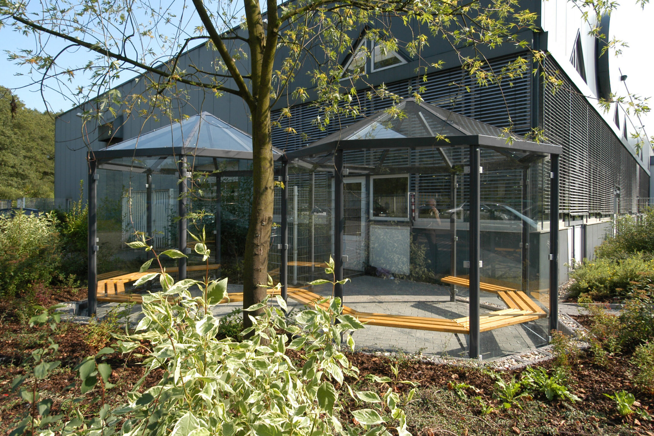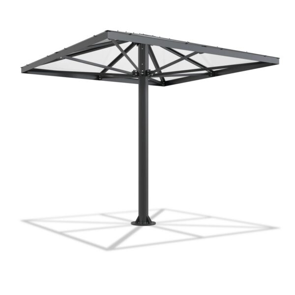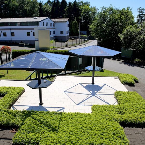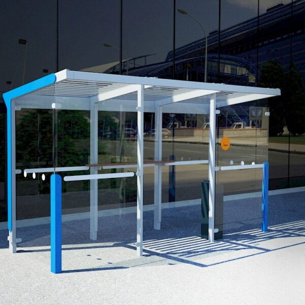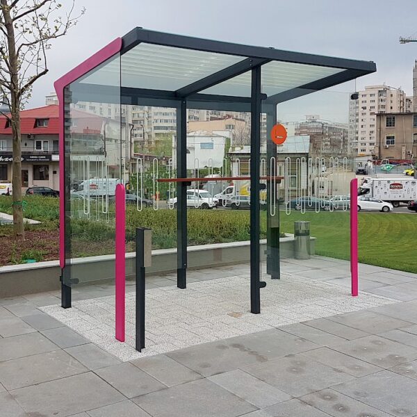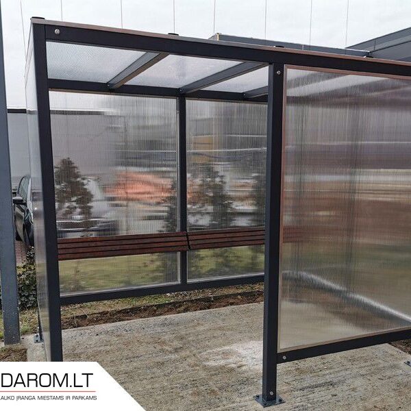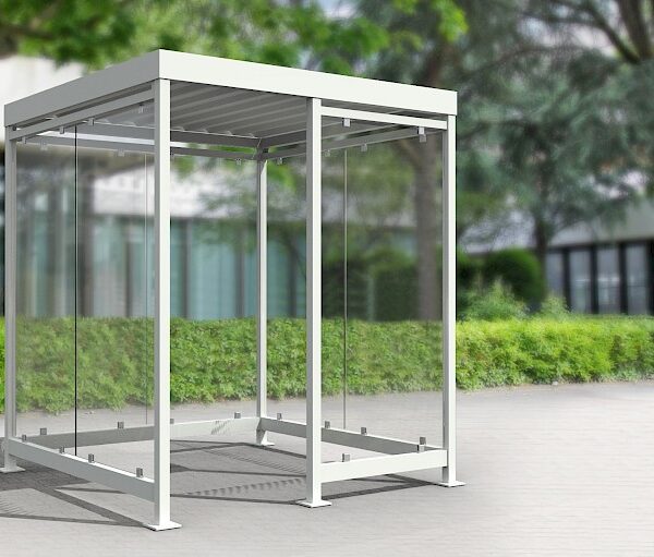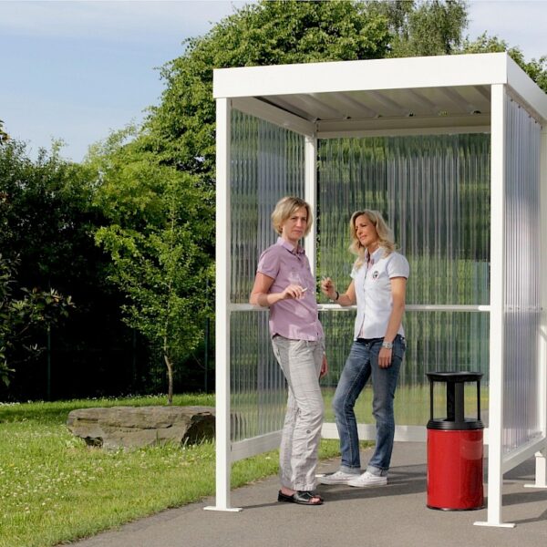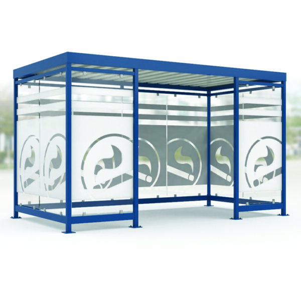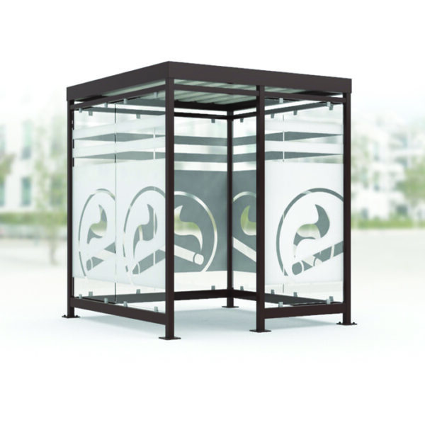 Astoņstūra smēķēšanas paviljoni konstrukcija no cinkota un krāsota, pēc RAL paletes, tērauda. Rūpīti apstrādāta stikla sienas, rūpīti apstrādāta stikla vai cinkota tērauda loksnes jumts. Enkurošana pamatā.