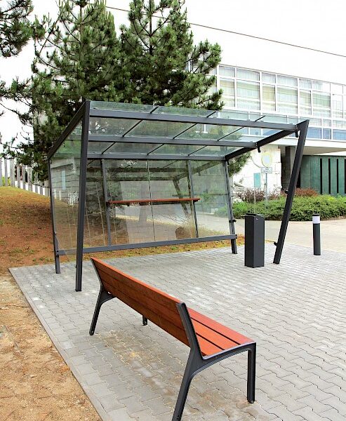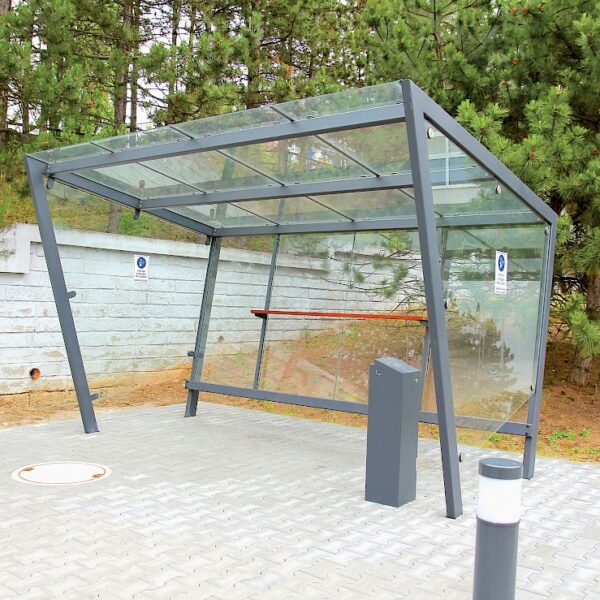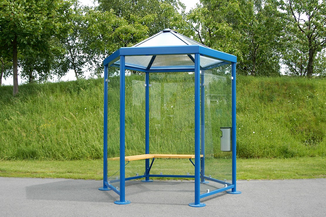 Sešstūra smēķēšanas paviljoni konstrukcija no cinkota un krāsota, pēc RAL paletes, tērauda. Rūpīti apstrādāta stikla sienas, rūpīti apstrādāta stikla vai cinkota tērauda loksnes jumts. Enkurošana pamatā.