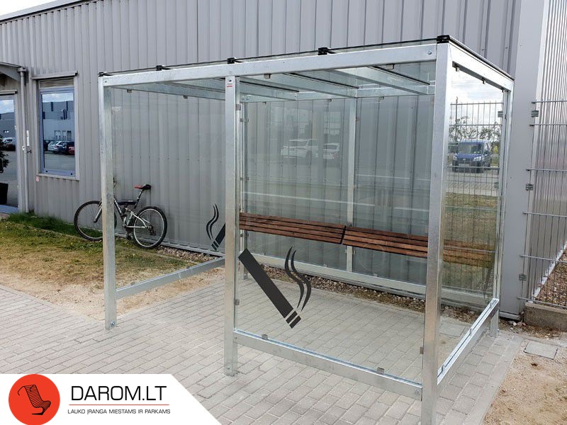 Rūkymo paviljono konstrukcija iš cinkuoto plieno, cinkuoto ir dažyto pagal RAL paletę, plieno arba iš nerūdijančio plieno. Grūdinto stiklo sienelės ir stogas. Galimas stiklo apklijavimas lipdukais. Yra medinė atrama viduje.