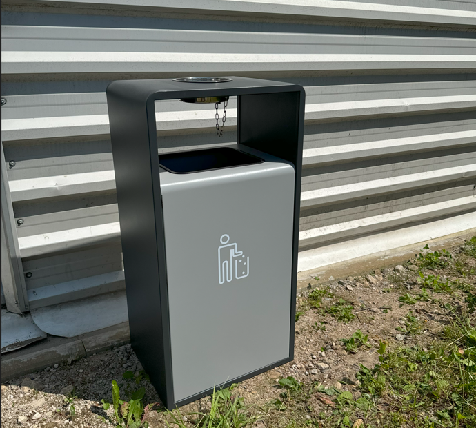 Konstrukcija iš cinkuoto plieno (spalva artima RAL7016) su dažyto plieno rakinamom durelėm (spalva artima RAL9006). Ant šiukšliadėžės informatyvus logotipas vaizduojantis šiukšlių išmetimą.