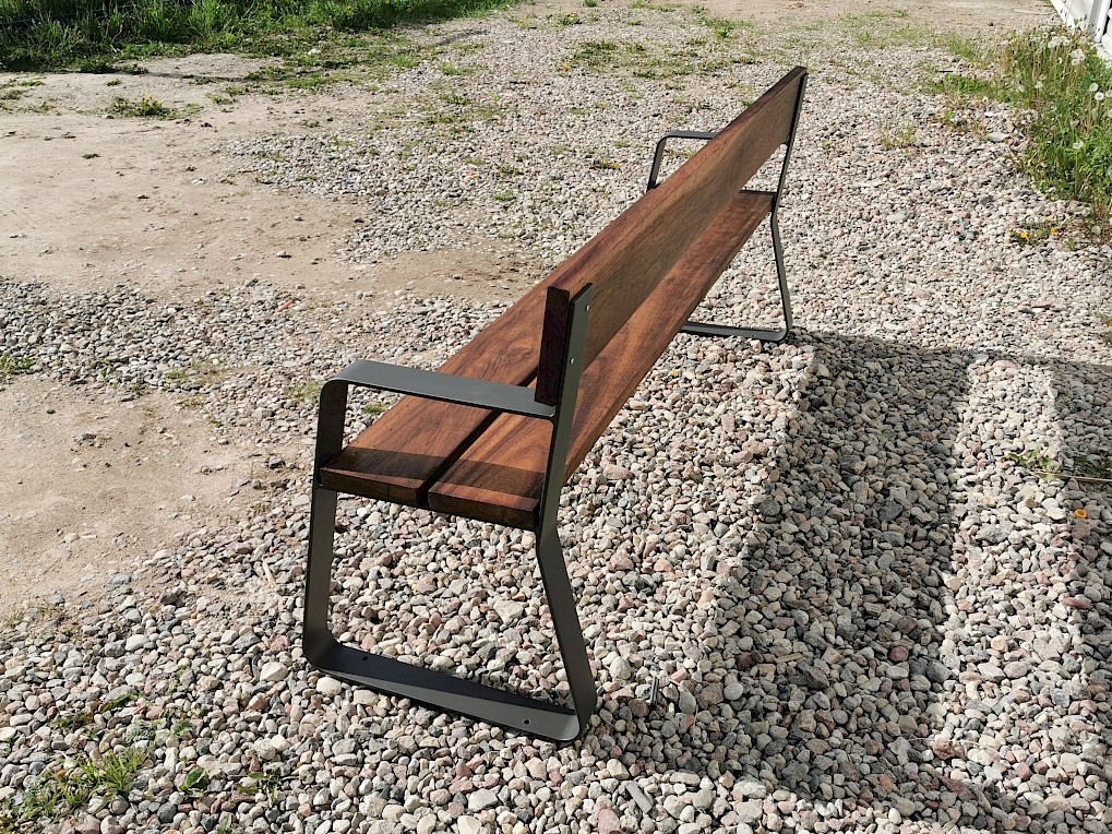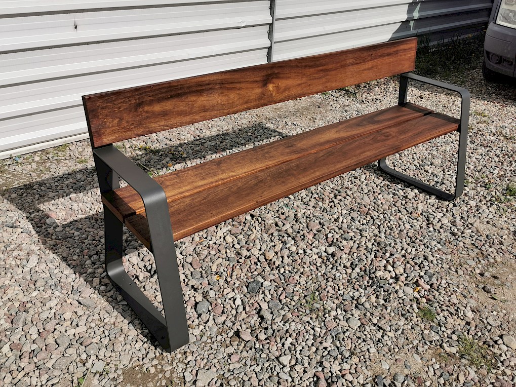 Sols Vilnius Plus ar atzveltni un roku balstu. Sols Vilnius Plus. Izmēri 2000x570x870h mm. Roku balsta augstums h650mm. Sēdošās daļas augstums h450mm. Kājas izgatavots no cinkotā un krāsota tērauda 6mm biezums. Koks – tropu cietais koks. Divas kājas. Dozes izmēri 2000x190x35h mm. Sēdošā daļa 2 dozes, atzveltne 1 doze. Kājas krāsotas RAL7016. Citas metāla krāsas ir iespējamas. Koks pārklāts ar eļļu. Antracīta krāsa +10%.