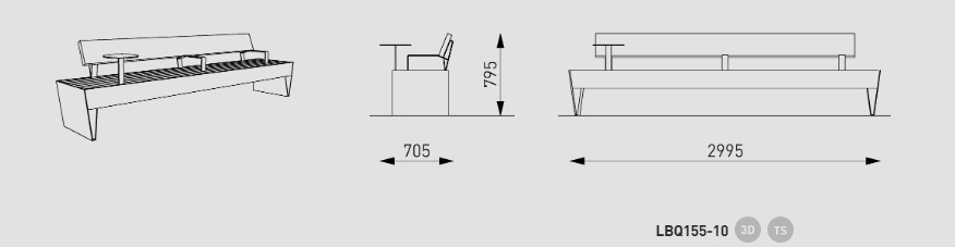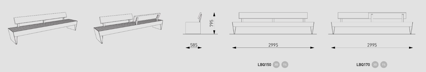 Lauko suoliukas Blocq. Suoliukas gaminamas su porankiais ar be jų. Su atlošu ar be atlošo. Įvairiausiu modifikacijų. Yra galimybė į suolą integruoti LED apšvietimą ir USB kroviklį.